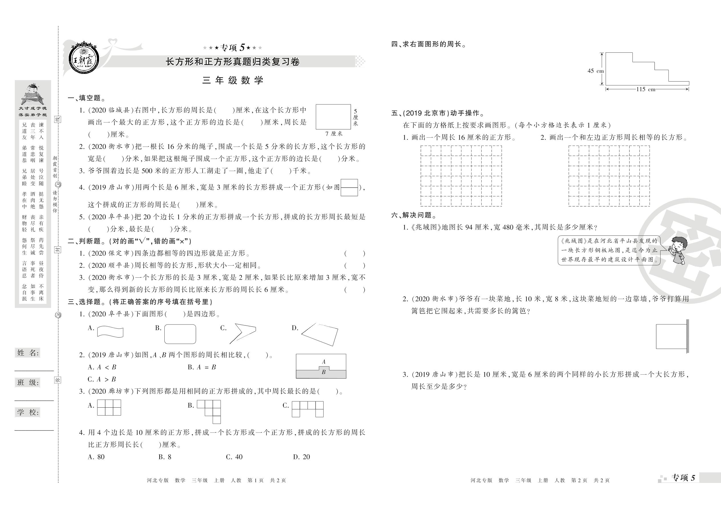 王朝霞期末专项卷——长方形和正方形、分数的初步认识三年级上册数学(人教版)【0】