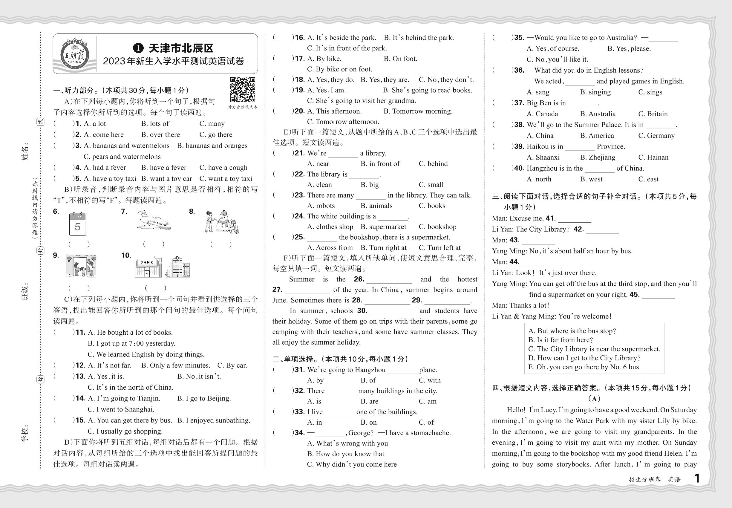 小升初·天津市北辰区2023年新生人学水平测试英语试卷【1】