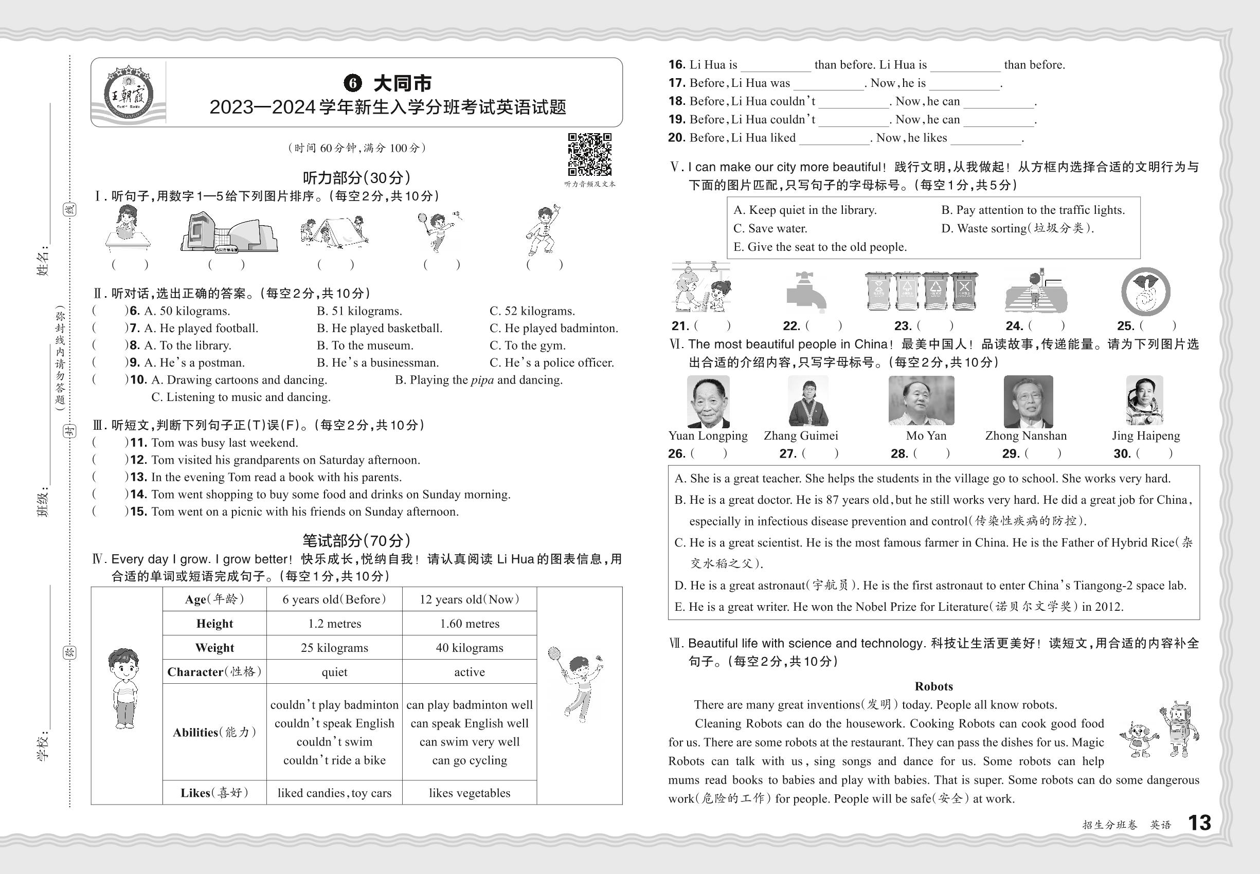 小升初·山西省大同市2023—2024学年新生人学分班考试英语试题【6】