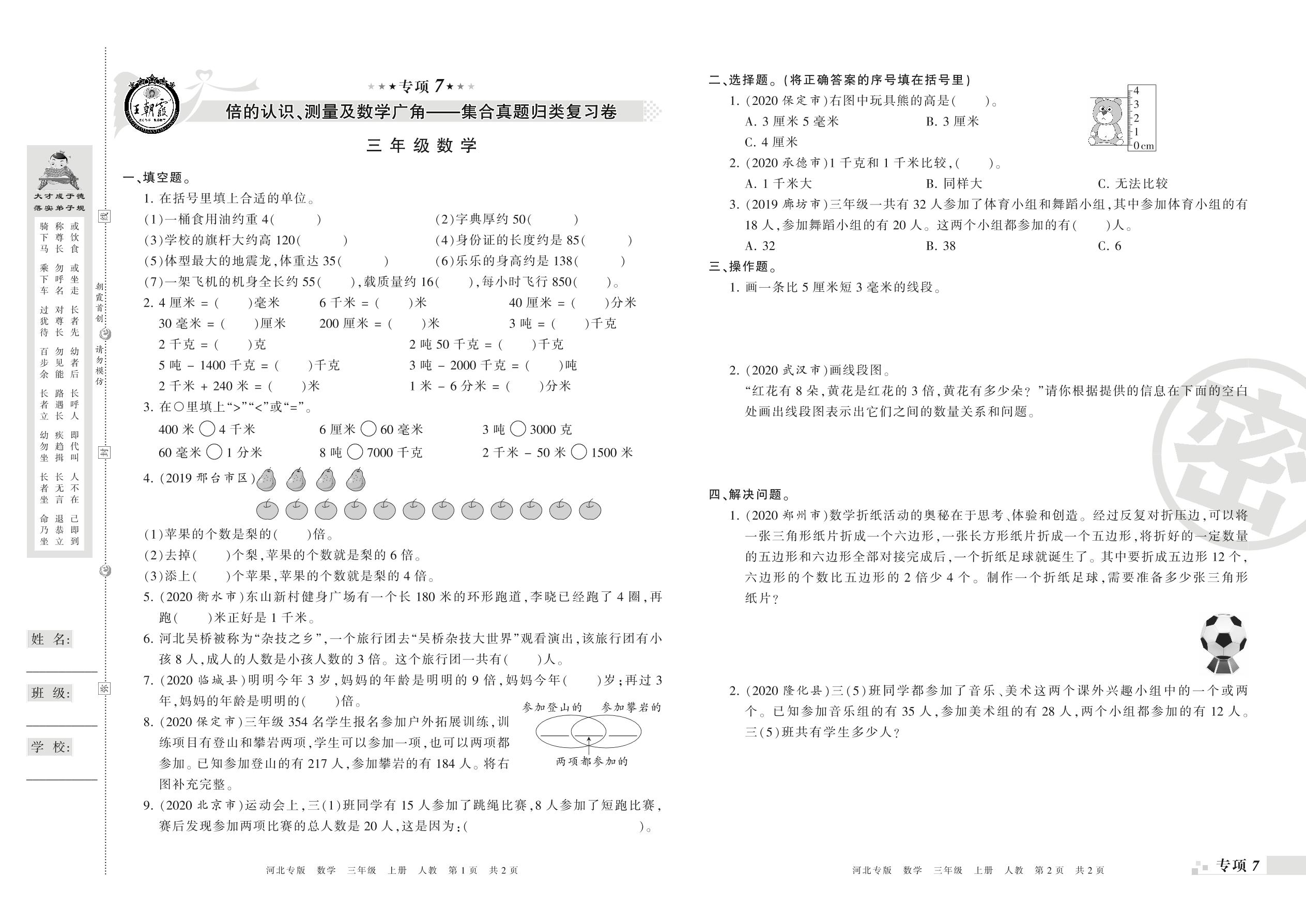 王朝霞期末专项卷——倍的认识、测量及集合真题归类复习、新颖题速递:生活与数学三年级上册数学(人教版)【0】