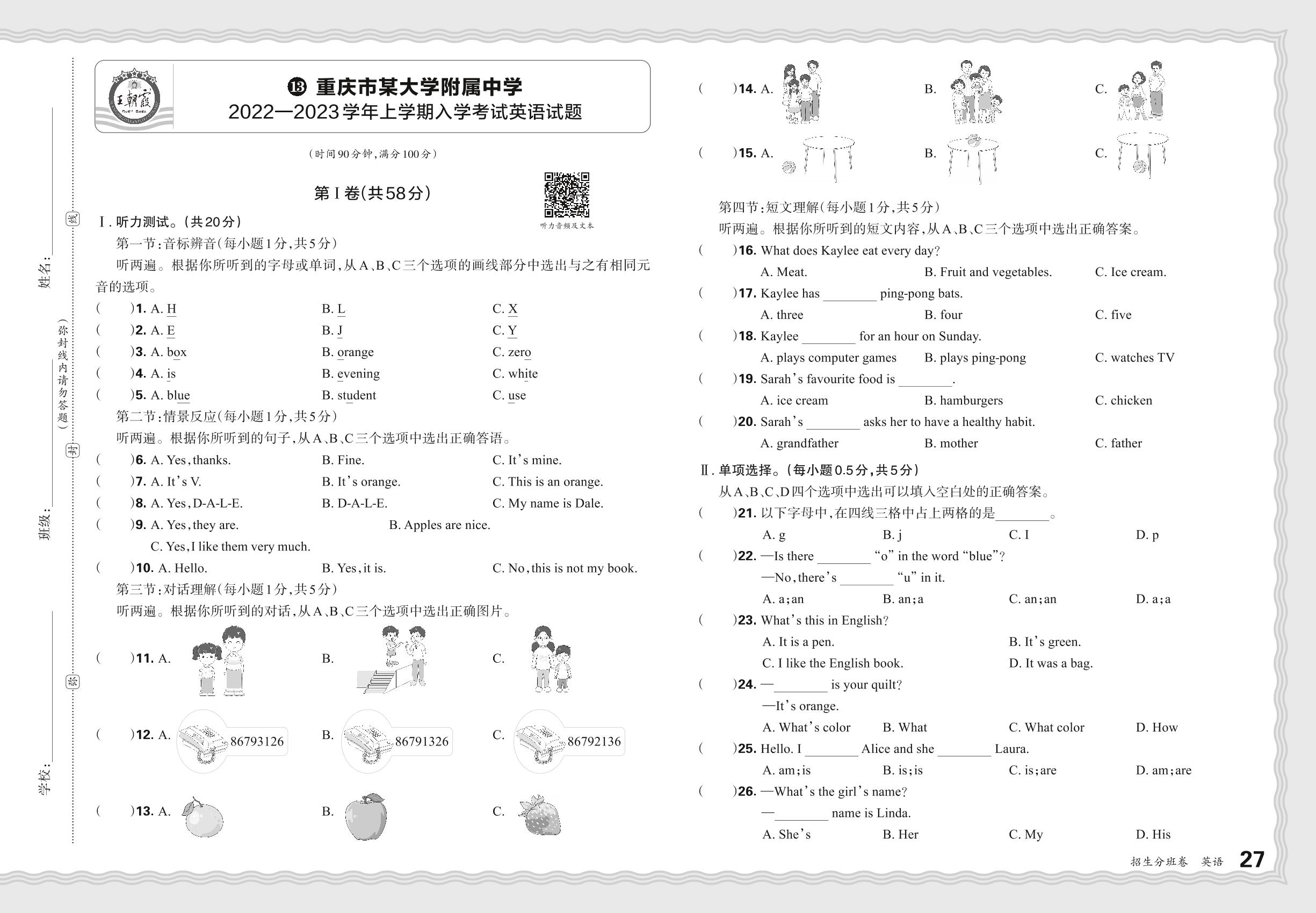重庆市某大学附属中学2022—2023学年上学期入学考试英语试题【13】