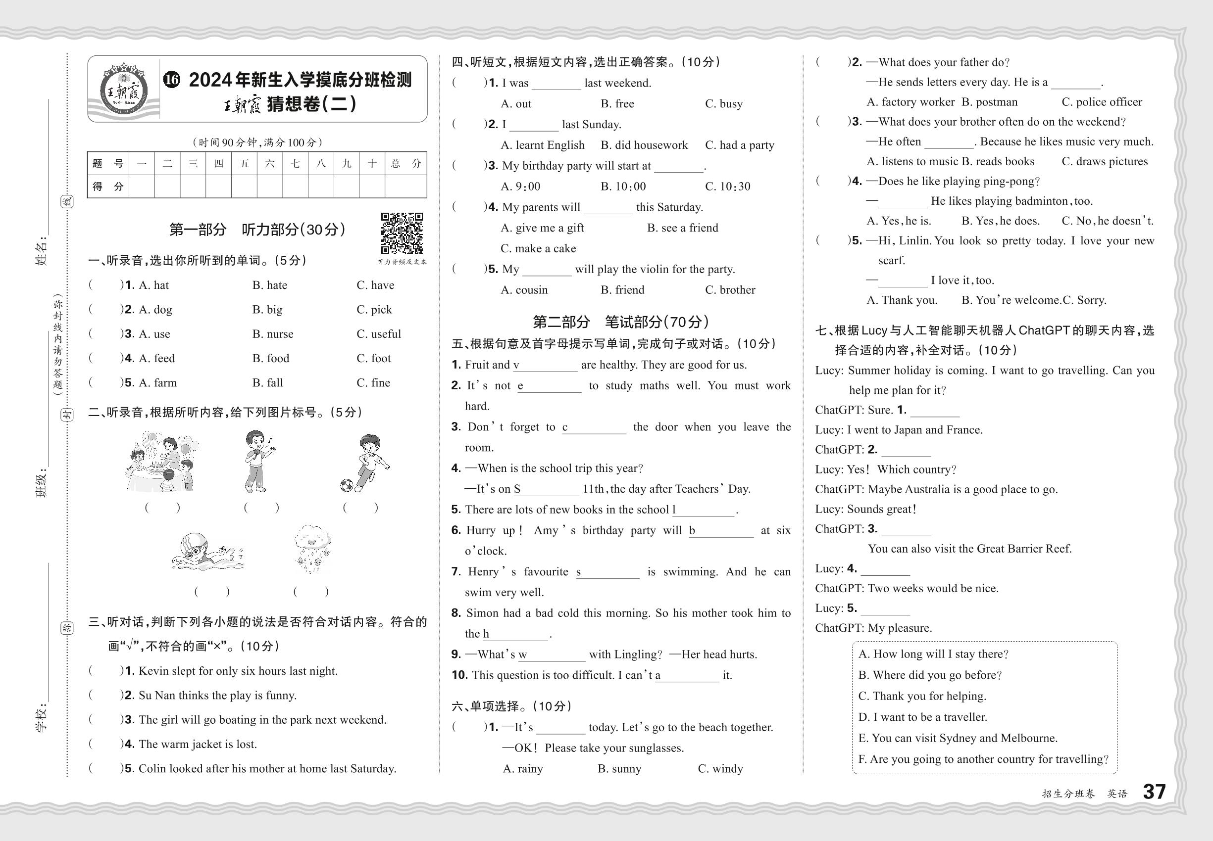 小升初英语·2024年新生入学摸底分班检测王朝霞猜想卷(二)【16】