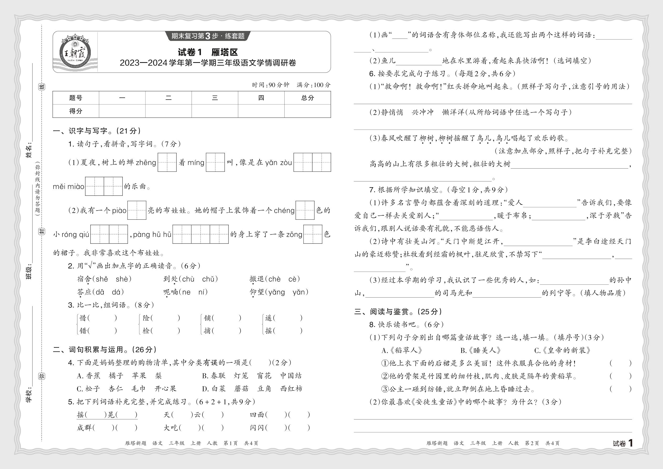 陕西省西安市雁塔区2023—2024学年第一学期三年级语文学情调研卷(人教版)【1】