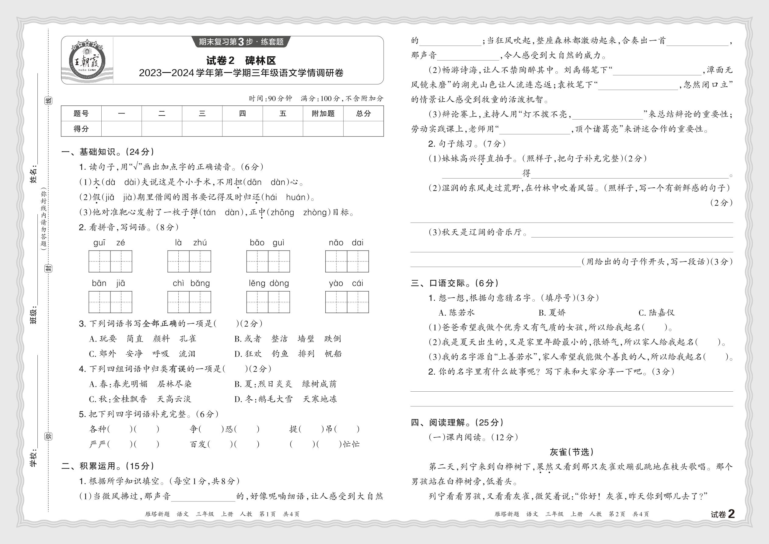 陕西省西安市碑林区2023—2024学年第一学期三年级语文学情调研卷(人教版)【2】