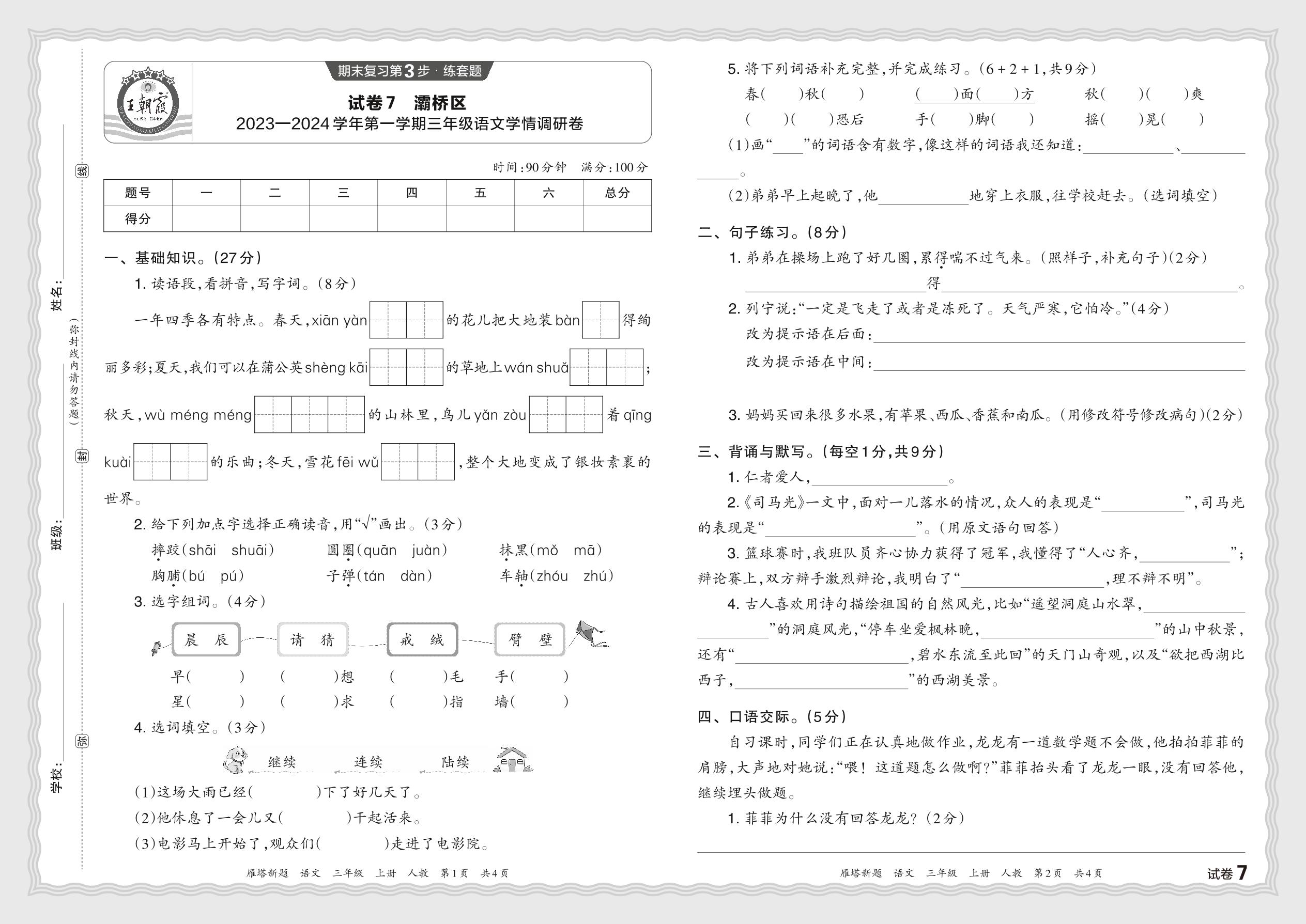陕西省西安市灞桥区2023—2024学年第一学期三年级语文学情调研卷(人教版)【7】