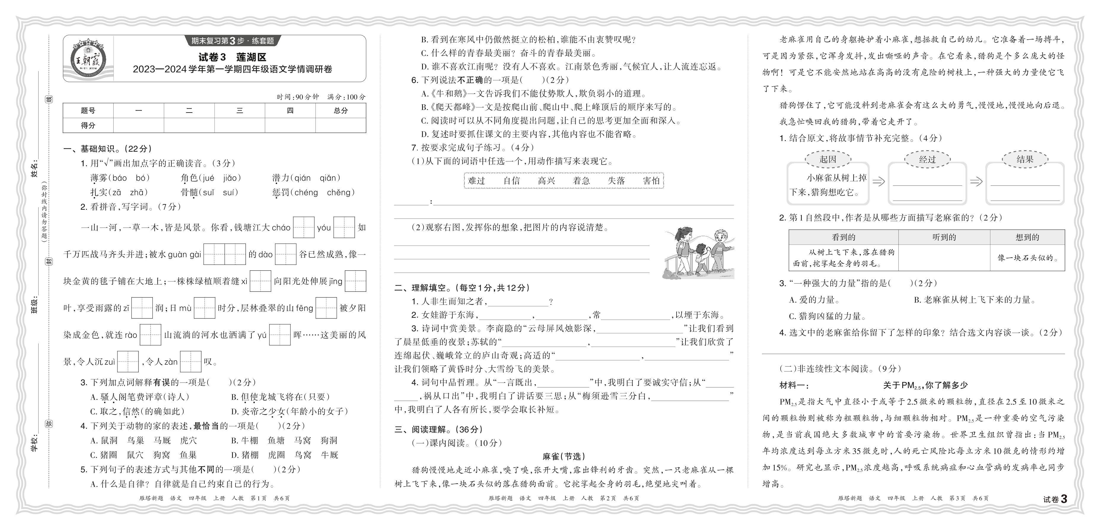 陕西省西安市莲湖区2023—2024学年第一学期四年级语文学情调研卷(人教版)【3】