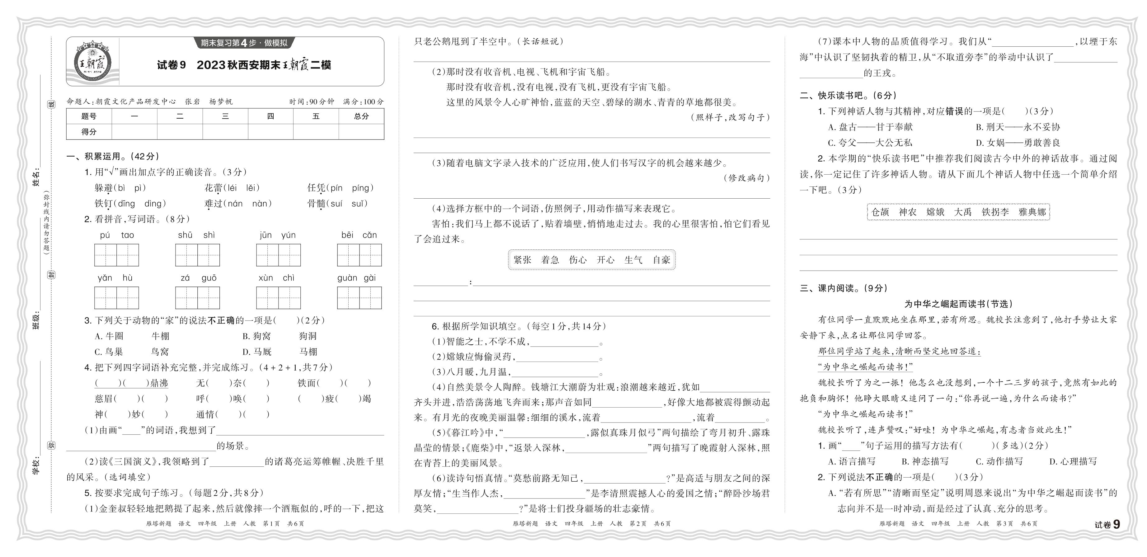 2023秋上册四年级语文人教版 陕西西安期末王朝霞二模