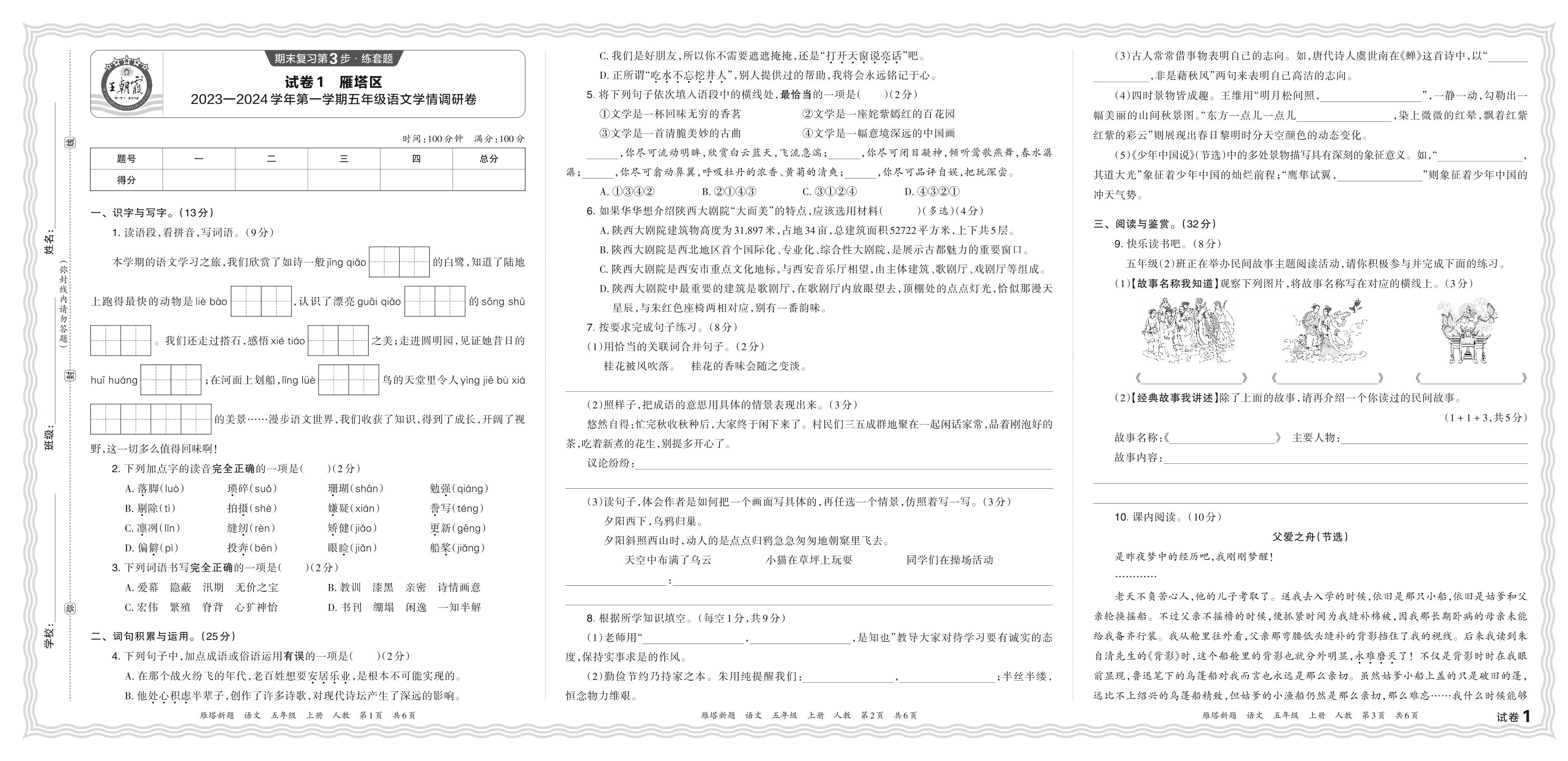 陕西省西安市雁塔区2023—2024学年第一学期五年级语文学情调研卷(人教版)【1】