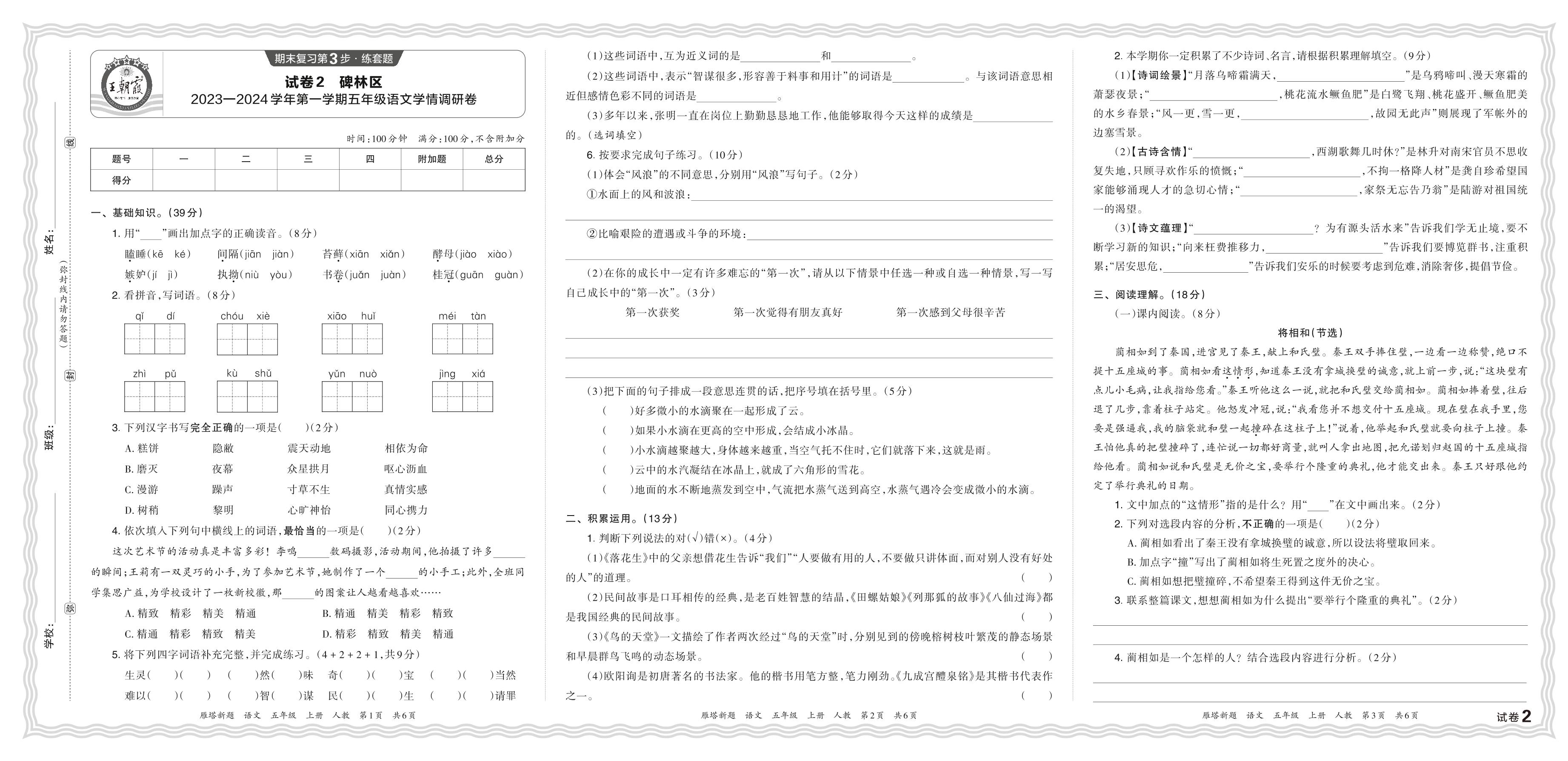 陕西省西安市碑林区2023—2024学年第一学期五年级语文学情调研卷(人教版)【2】