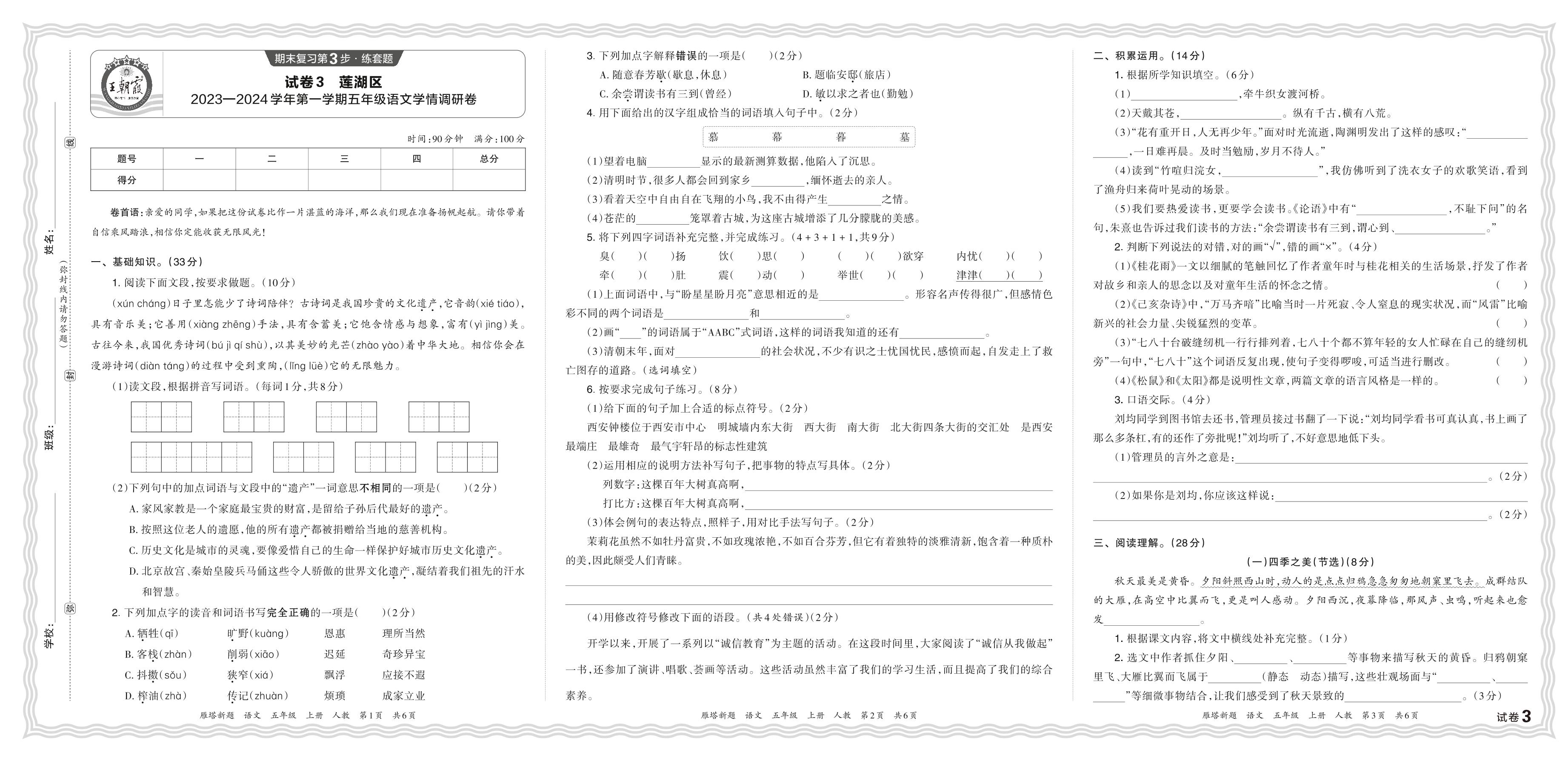 陕西省西安市莲湖区2023—2024学年第一学期五年级语文学情调研卷(人教版)【3】