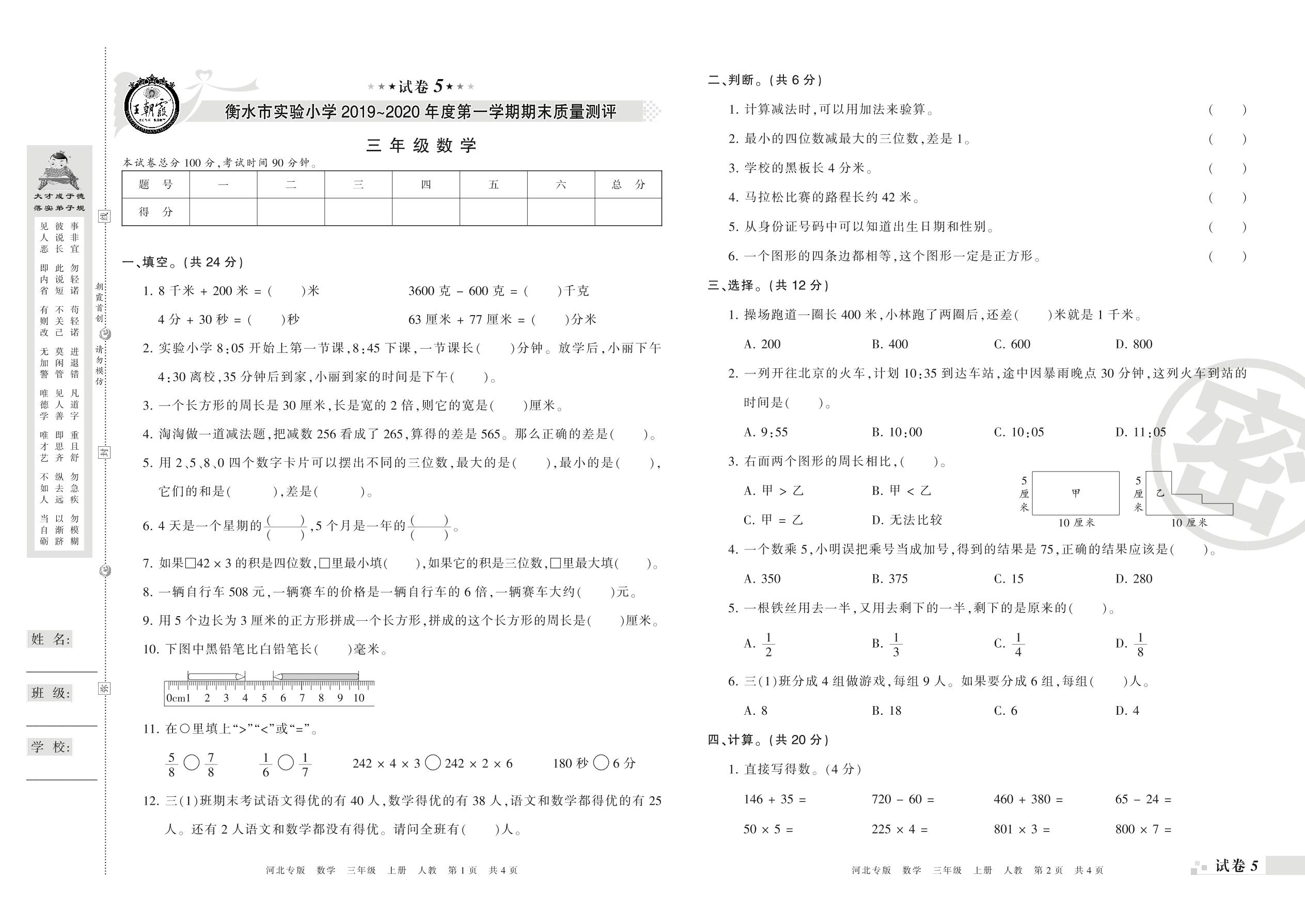 2019-2020学年第一学期衡水市实验小学三年级数学试卷(人教版)【5】