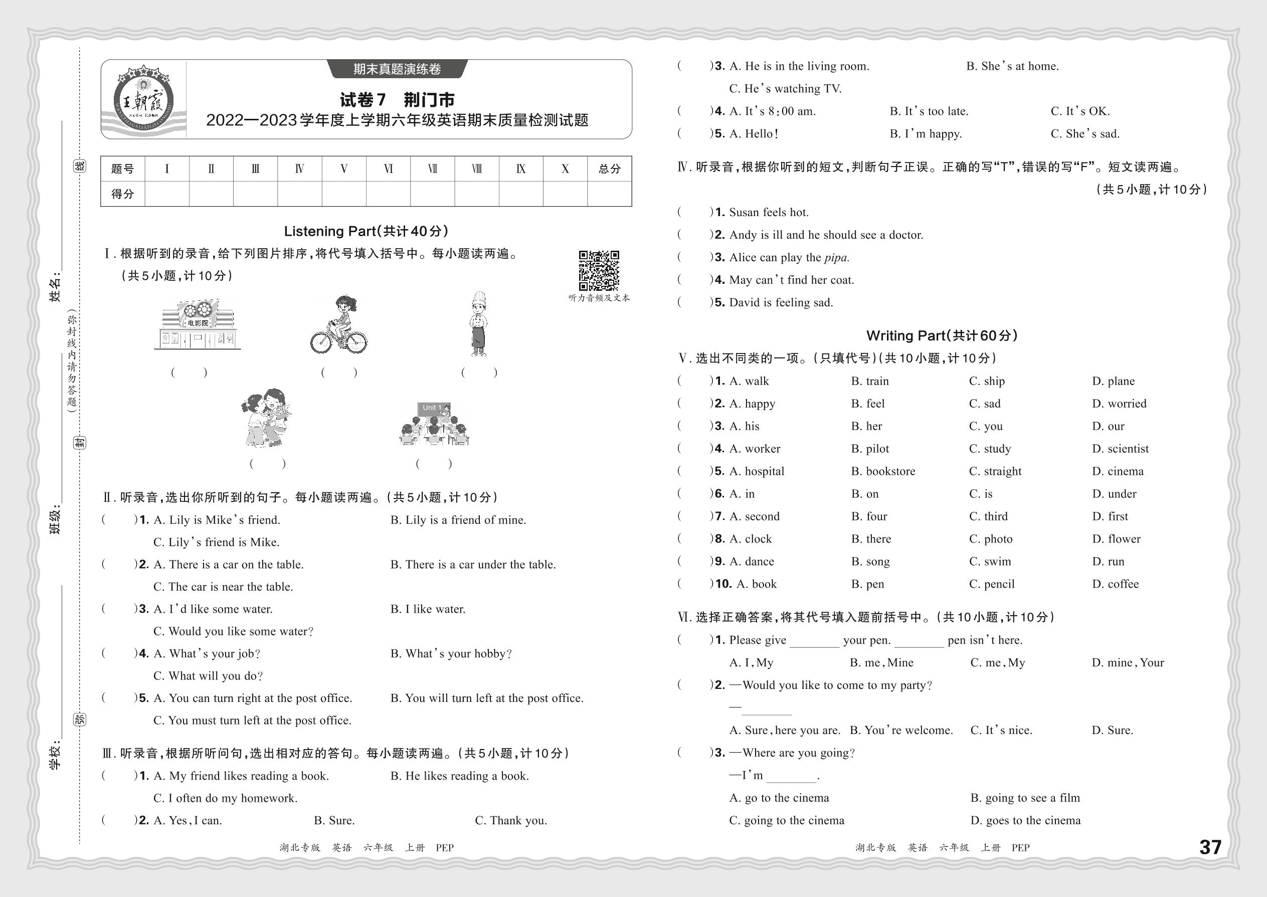 六年级英语人教PEP版(三起始)上册期末卷