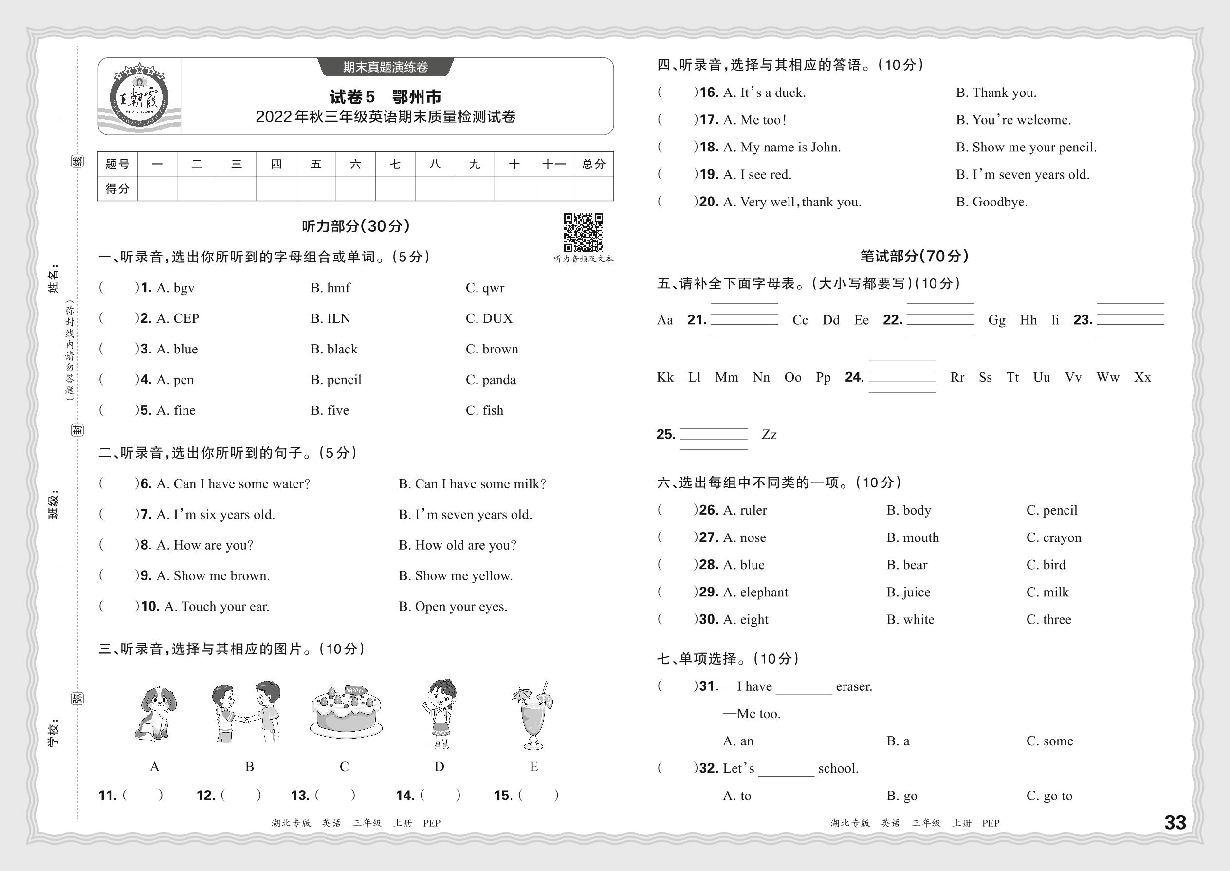 湖北省鄂州市2022年秋三年级英语期末质量检测试卷(PEP版)【5】