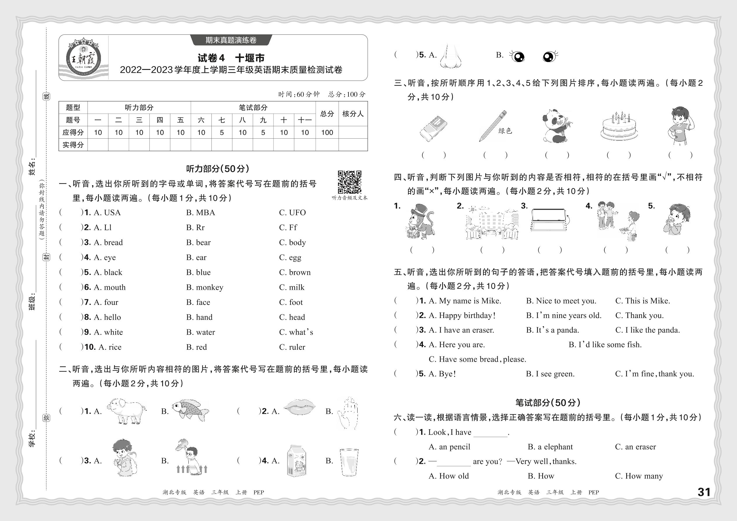 湖北省十堰市2022—2023学年度上学期三年级英语期末质量检测试卷(PEP版)【4】