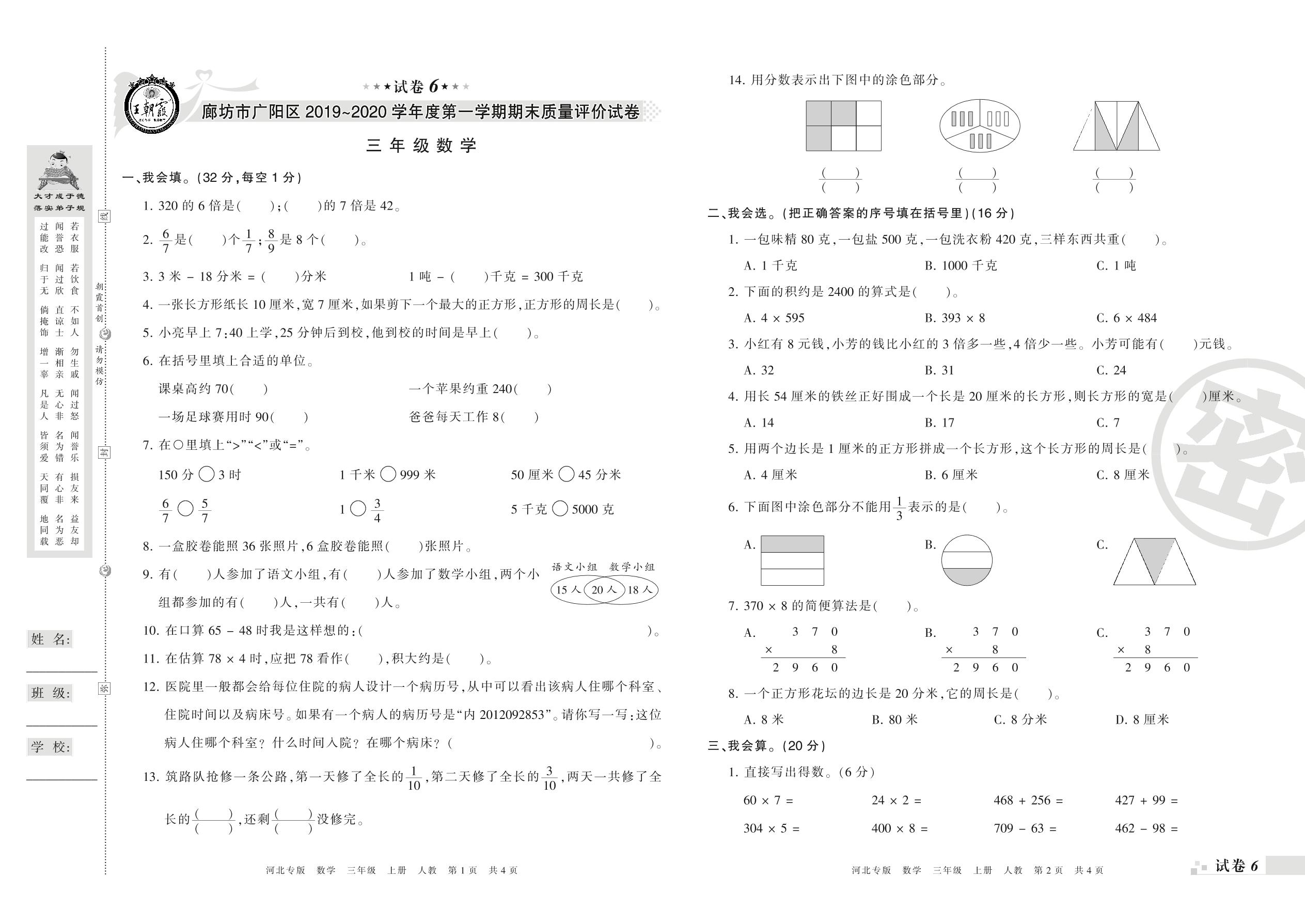 2019-2020学年第一学期廊坊市广阳区三年级数学试卷(人教版)【6】