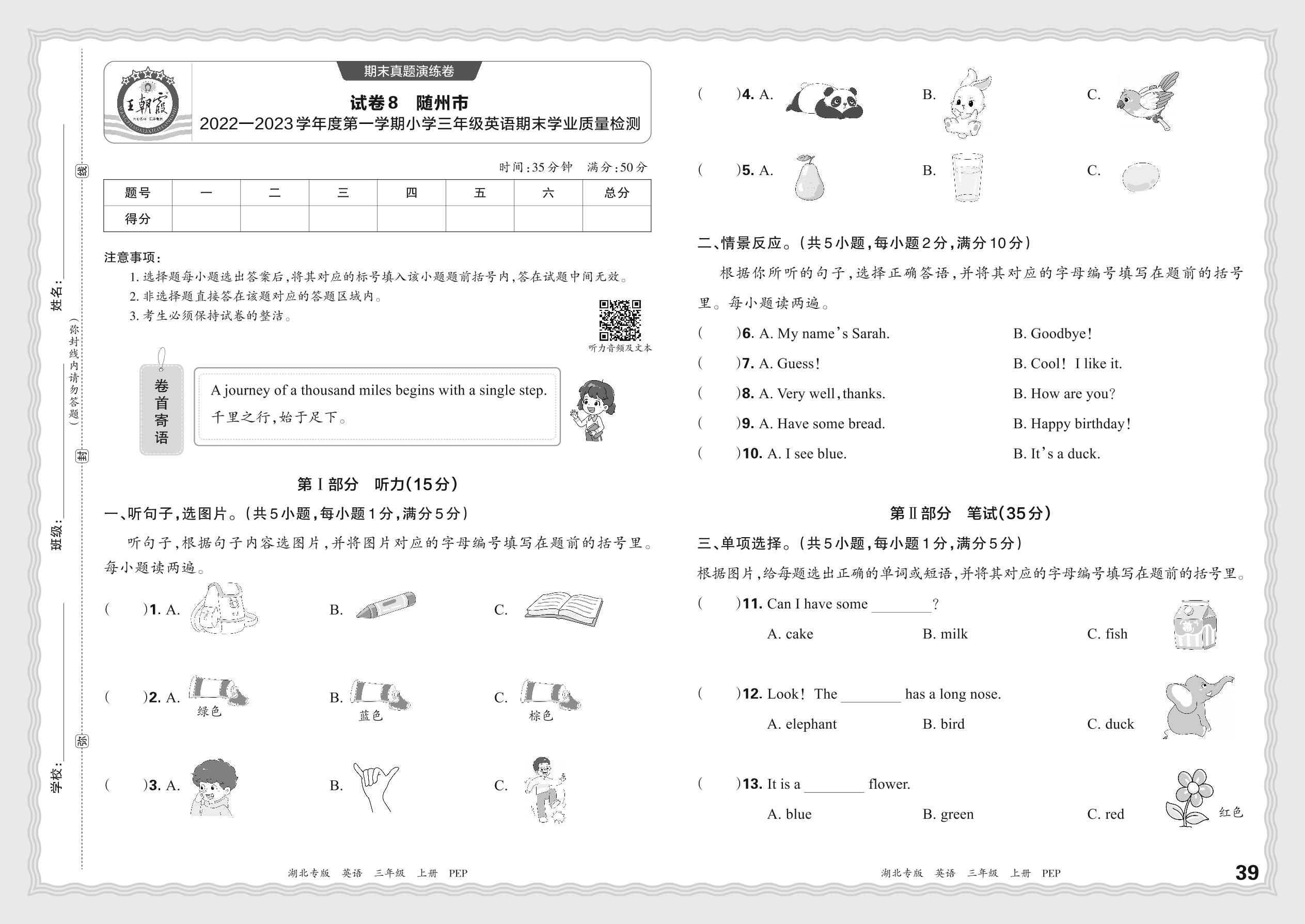 湖北省随州市2022—2023学年度第一学期小学三年级英语期末学业质量检测(PEP版)【8】
