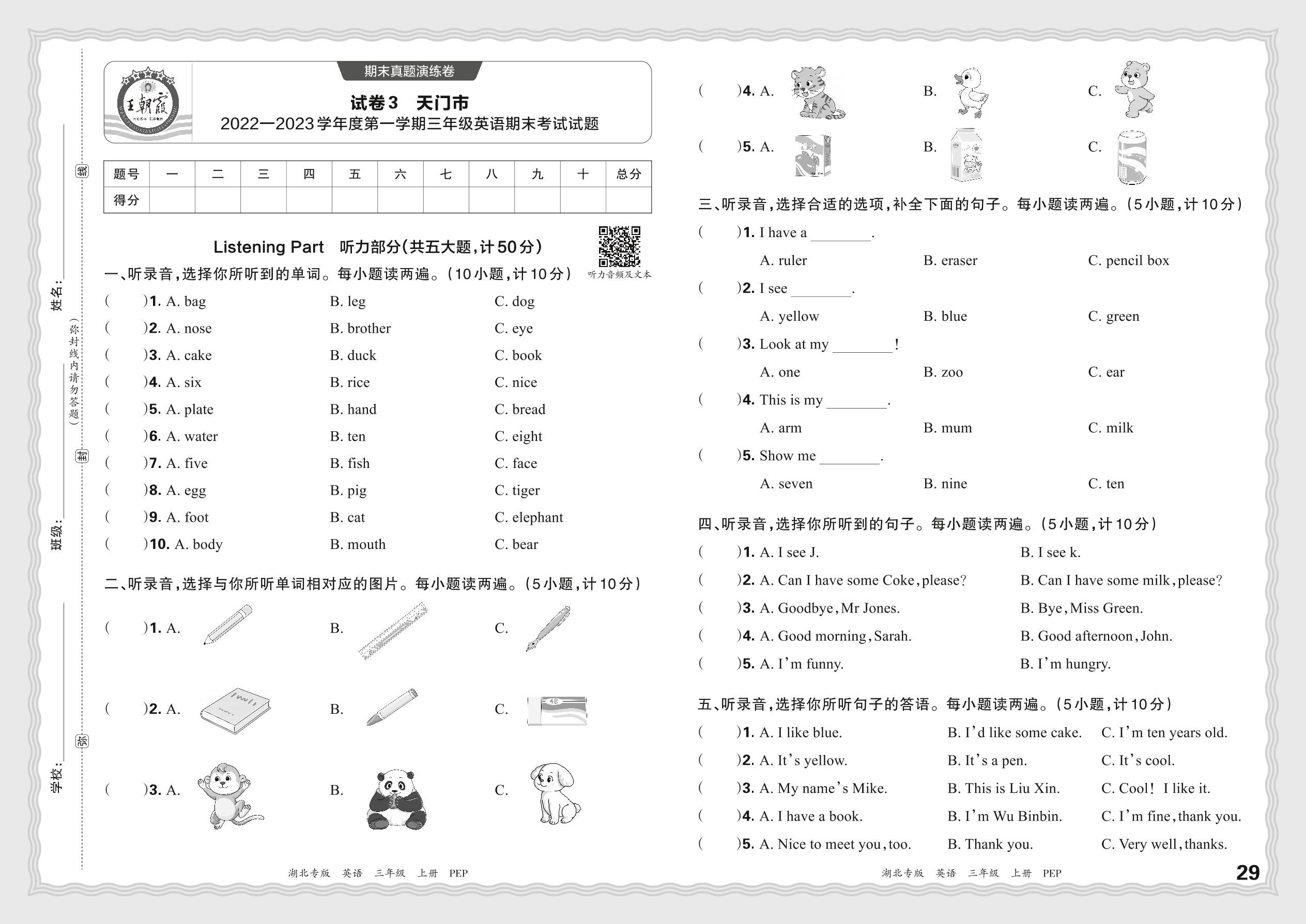 湖北省天门市2022—2023学年度第一学期三年级英语期末考试试题(PEP版)【3】