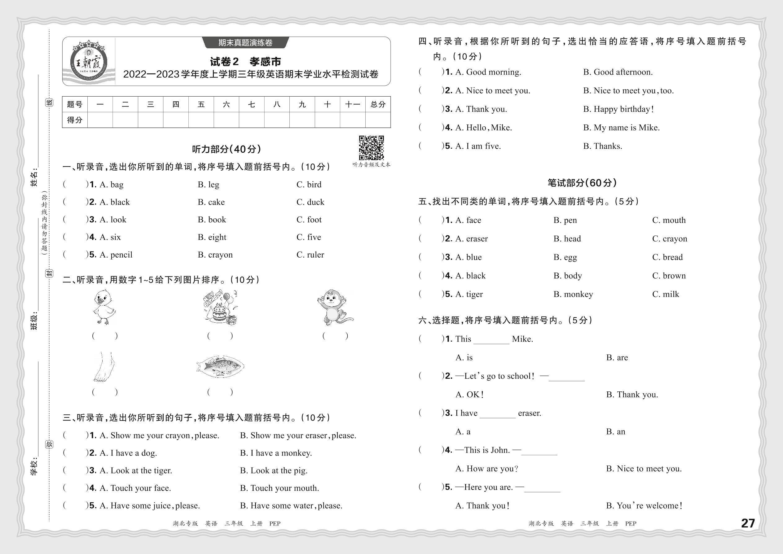 湖北省孝感市2022—2023学年度上学期三年级英语期末学业水平检测试卷(PEP版)【2】