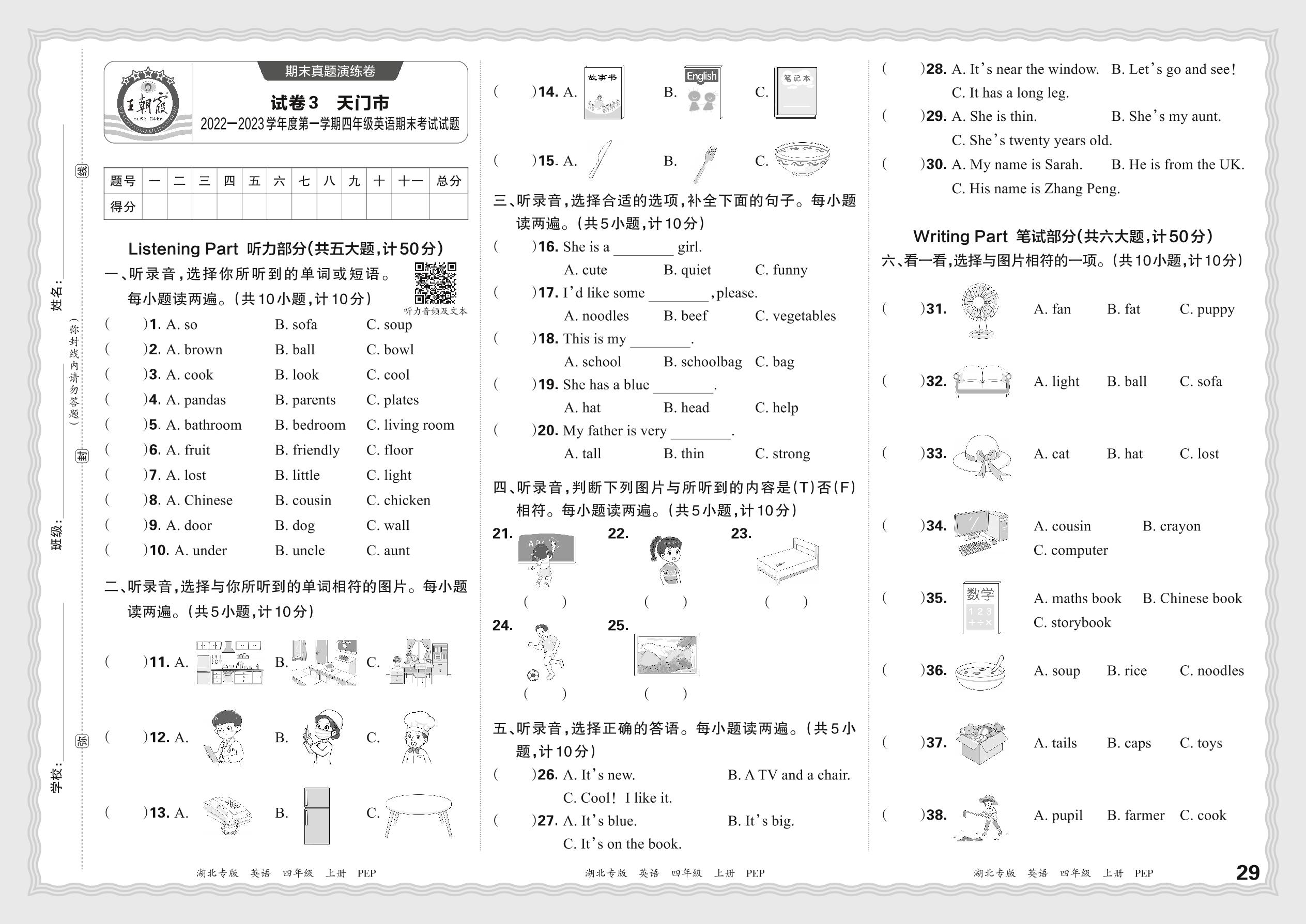 湖北省天门市2022—2023学年度第一学期四年级英语期末考试试题(PEP版)【3】