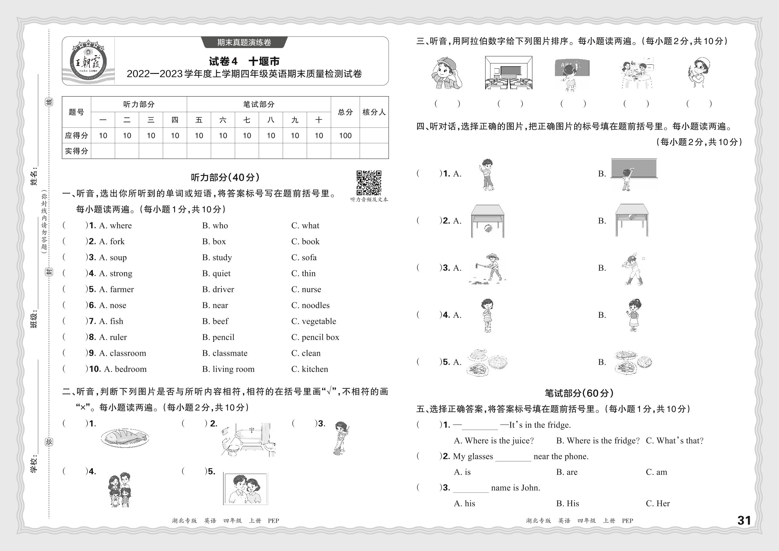 湖北省十堰市2022—2023学年度上学期四年级英语期末质量检测试卷(PEP版)【4】
