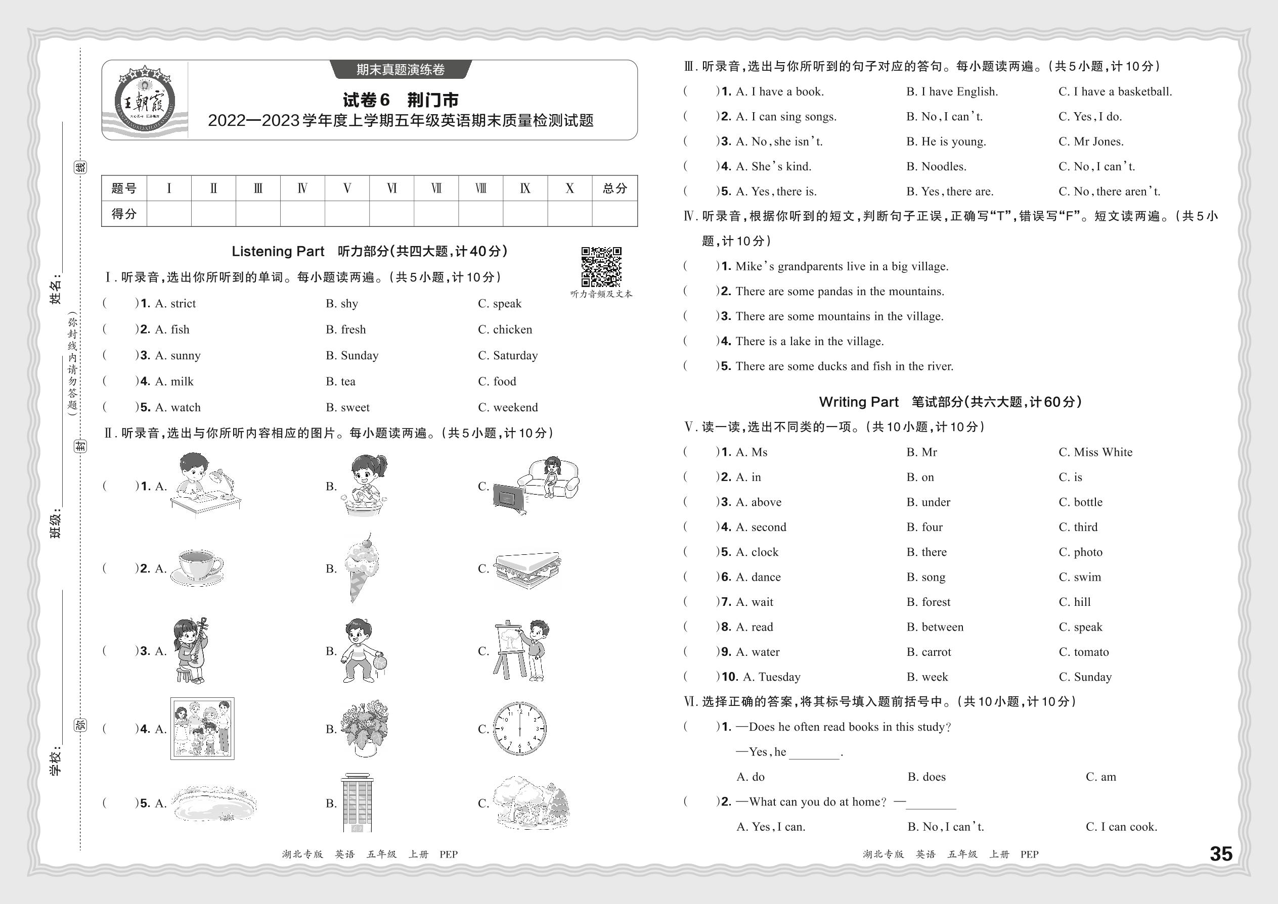 湖北省荆门市2022—2023学年度上学期五年级英语期末质量检测试题(PEP版)【6】