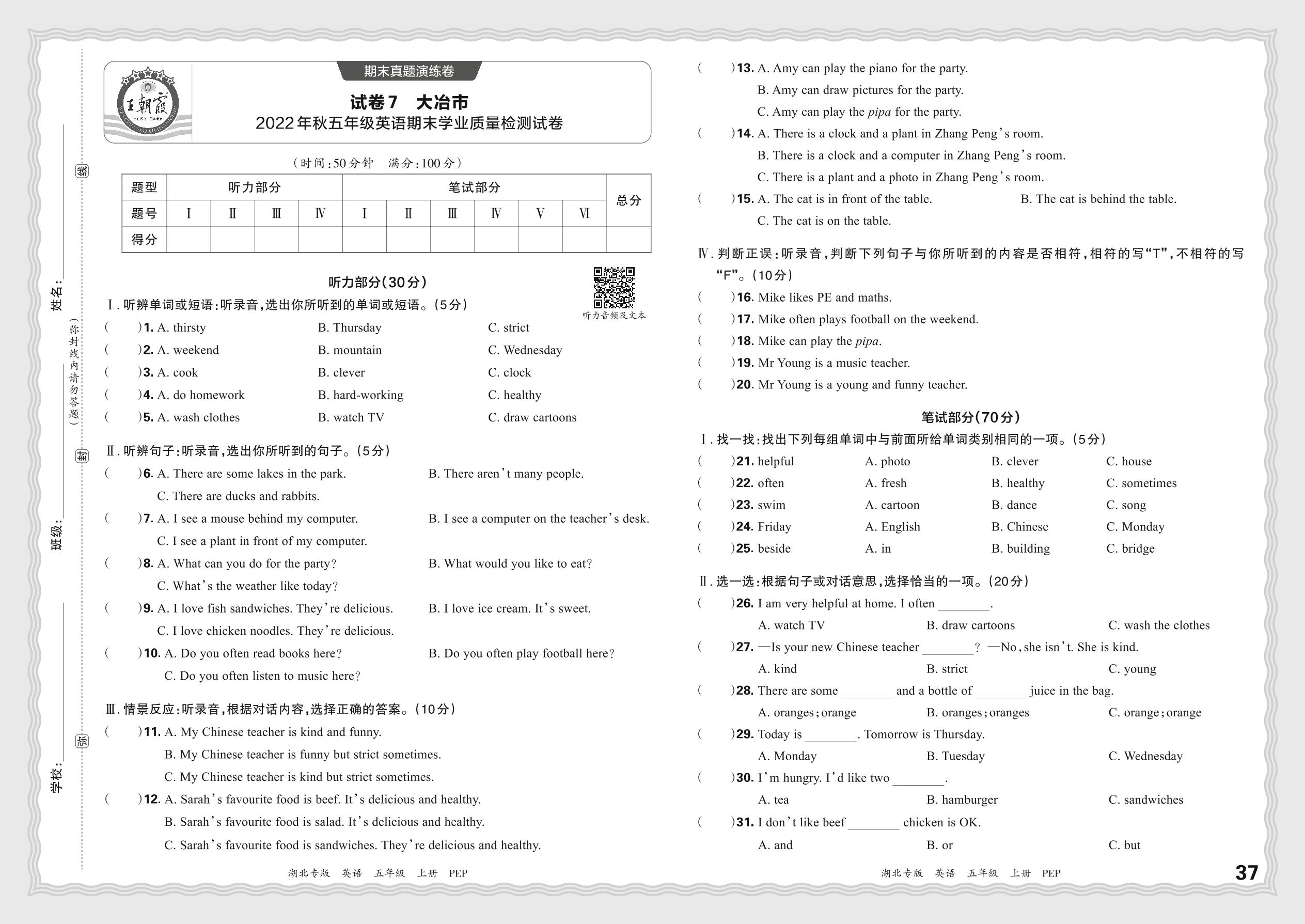 湖北省黄石市大冶市2022年秋五年级英语素质教育目标检测试卷(PEP版)【7】