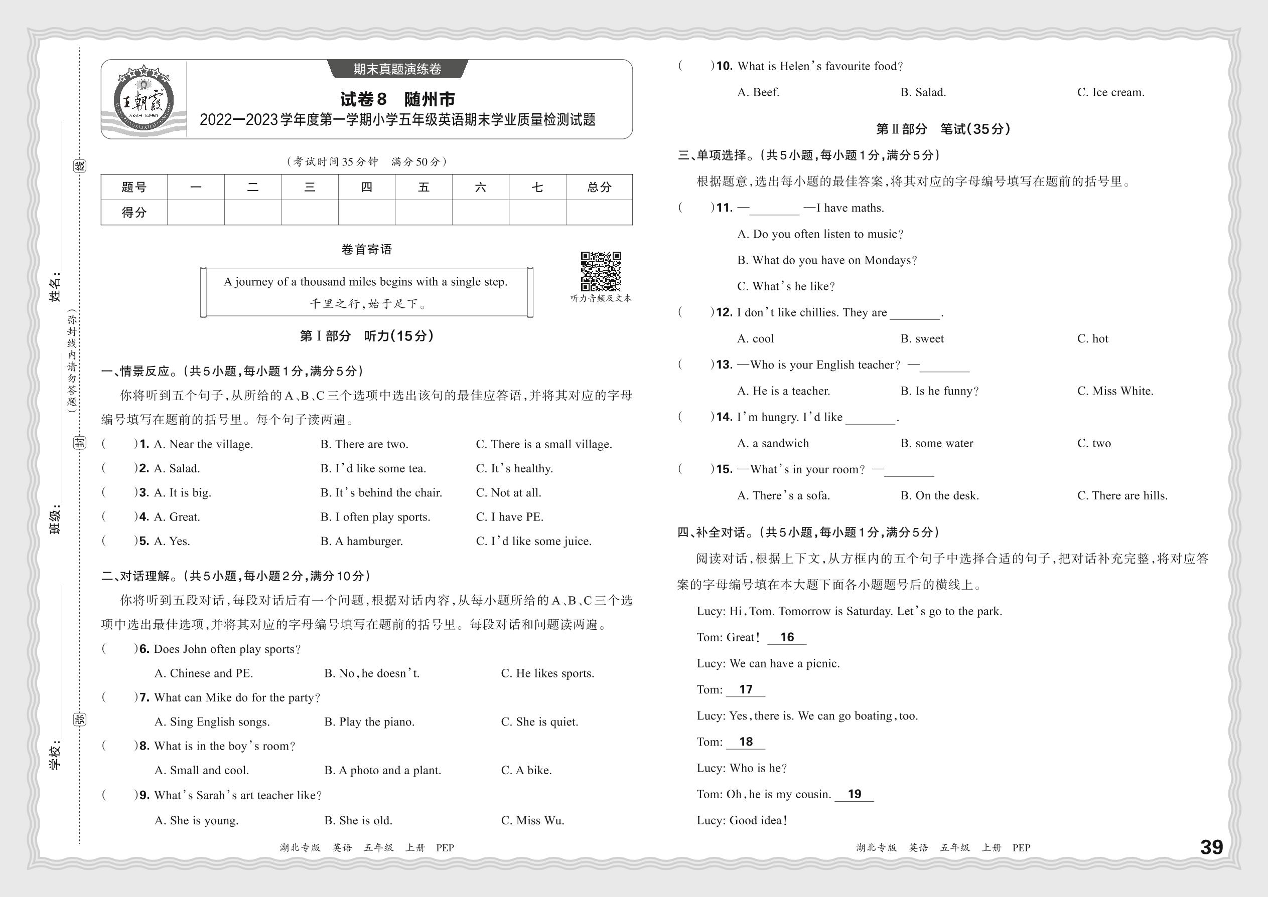 湖北省随州市2022—2023学年度第一学期小学五年级英语期末学业质量检测(PEP版)【8】