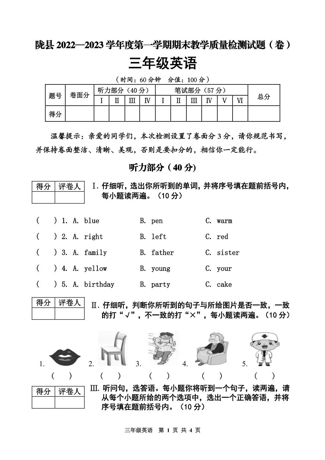 陕西省宝鸡市陇县2022-2023学年度第一学期期末教学质量检测试题卷三年级英语(冀教版)【无听力音频】