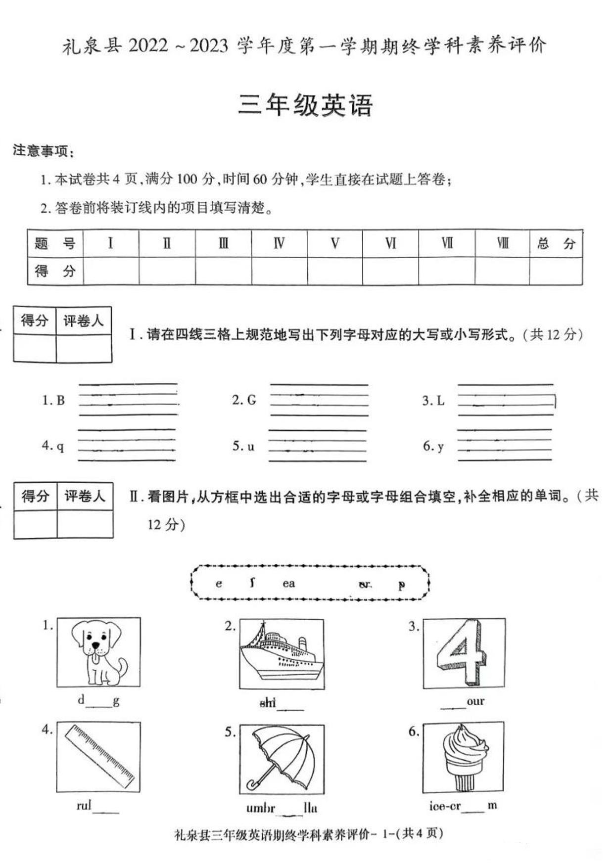 陕西省咸阳市礼泉县2022-2023学年度第一学期期终学科素养评价三年级英语(陕旅版)【无听力音频】