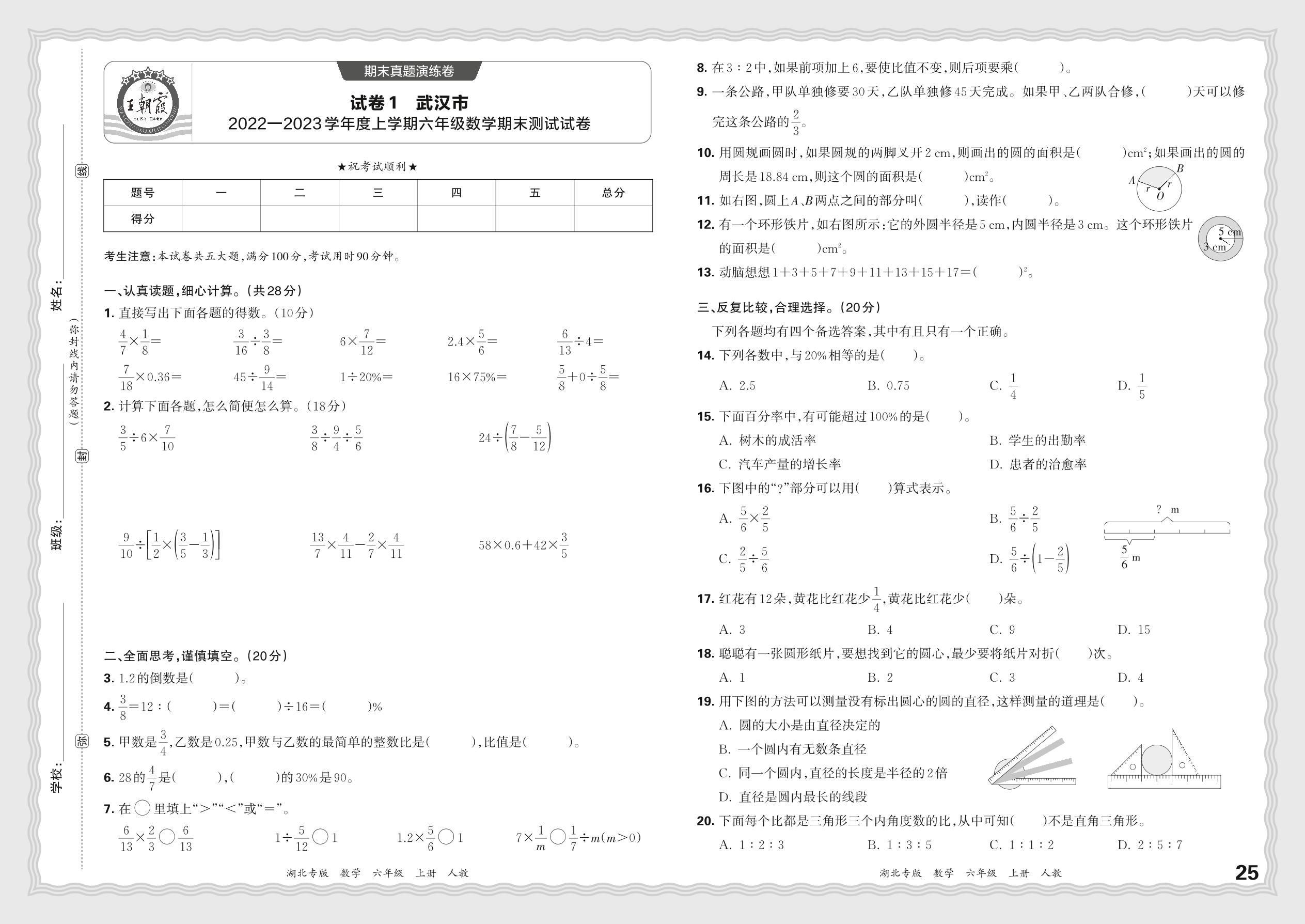 湖北省武汉市2022—2023学年度上学期六年级数学期末测试试卷(人教版)【1】
