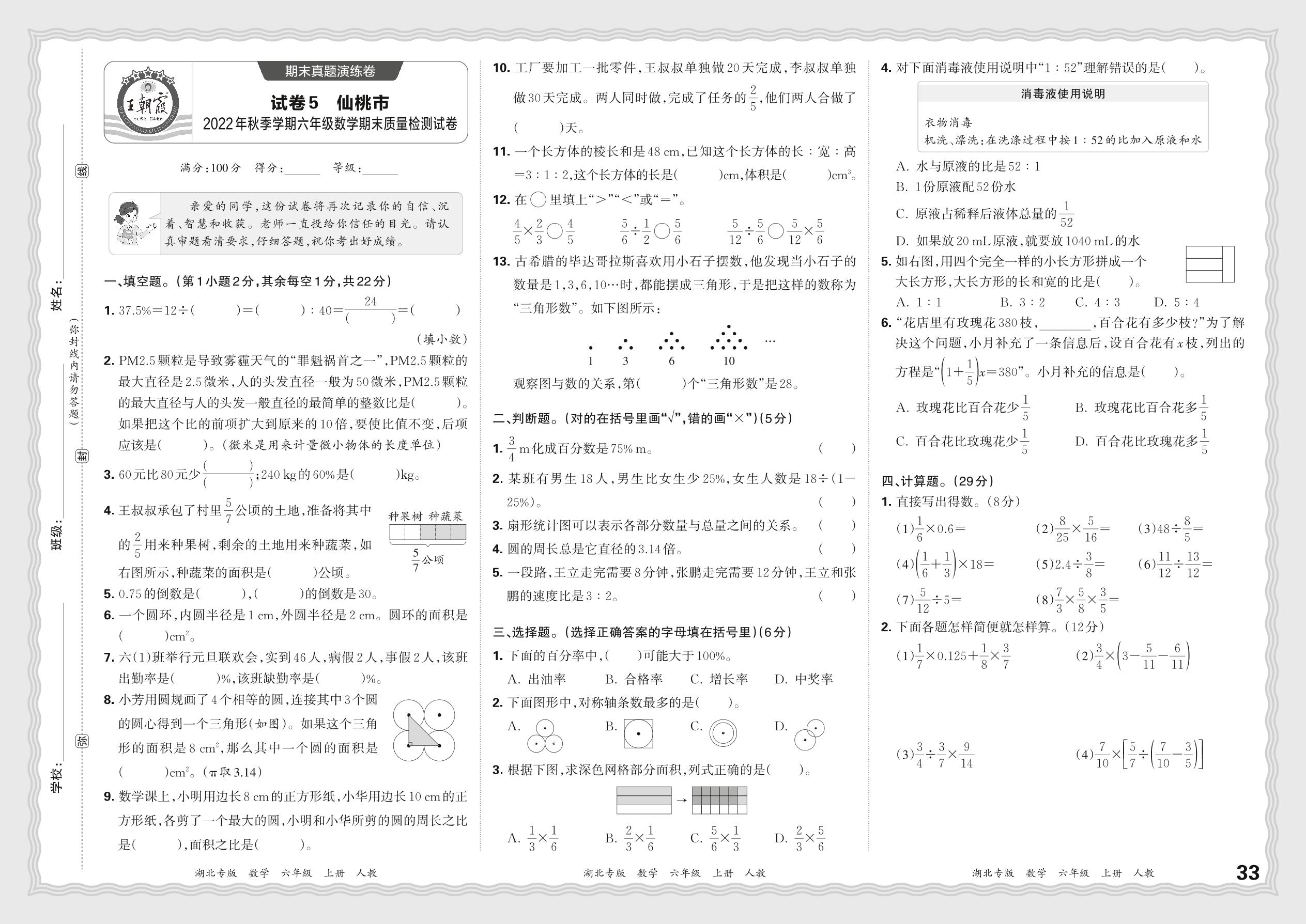 湖北省仙桃市2022年秋季学期六年级数学期末质量检测试卷(人教版)【5】
