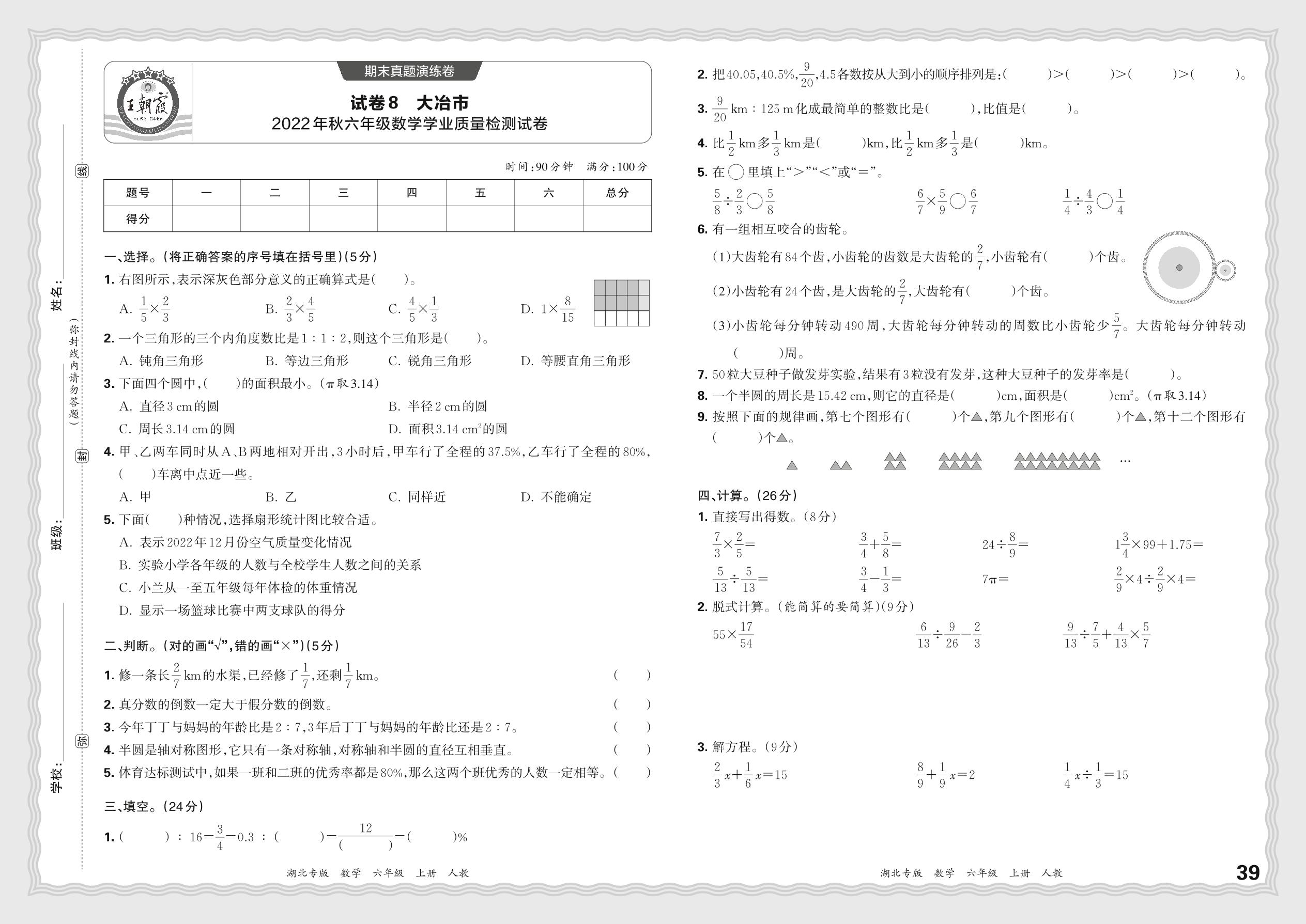 湖北省黄石市大冶市2022年秋六年级数学学业质量检测试卷(人教版)【8】