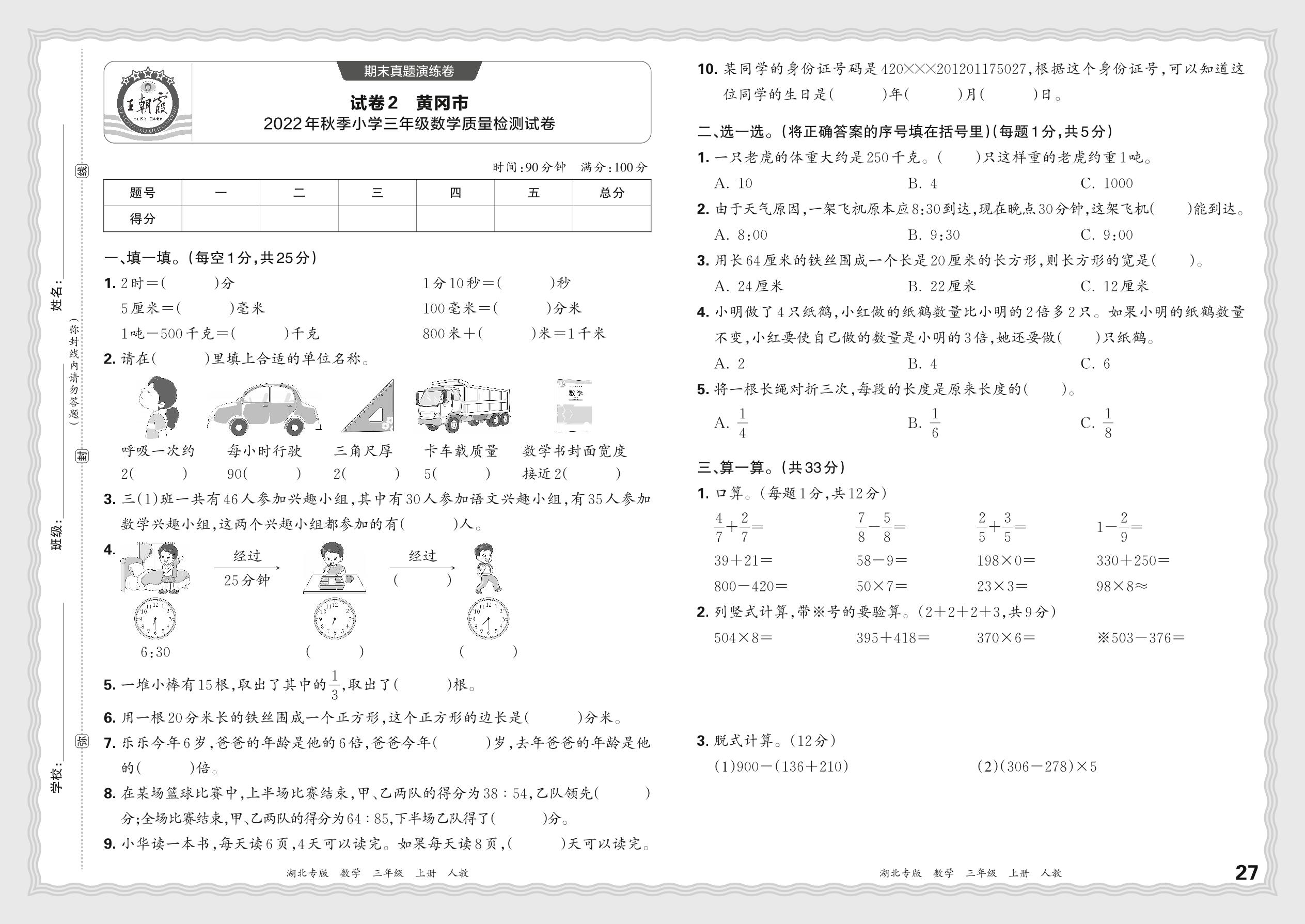 湖北省黄冈市2022年秋季小学三年级数学质量检测试卷(人教版)【2】