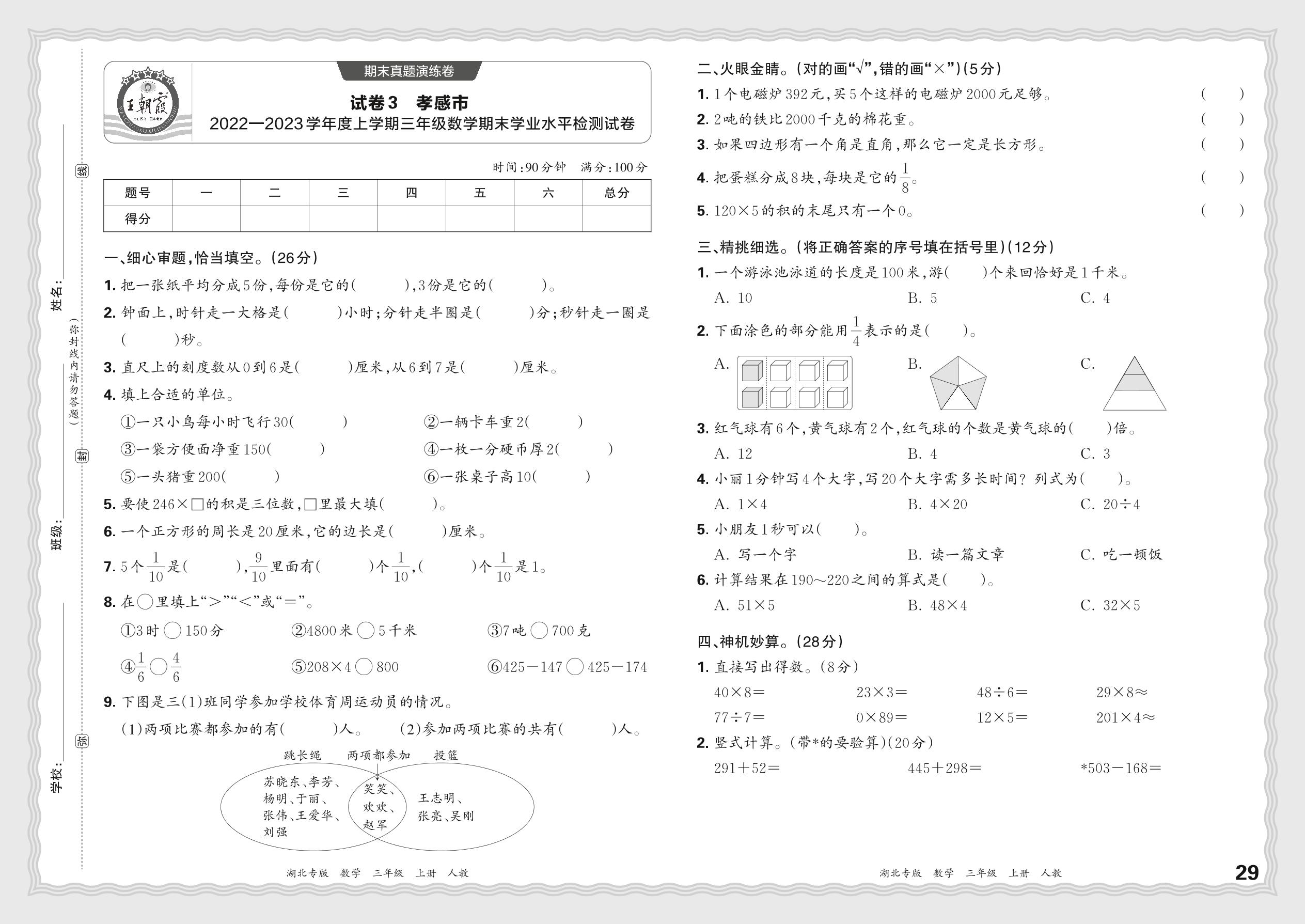 湖北省孝感市2022—2023学年度上学期三年级数学期末学业水平检测试卷(人教版)【3】