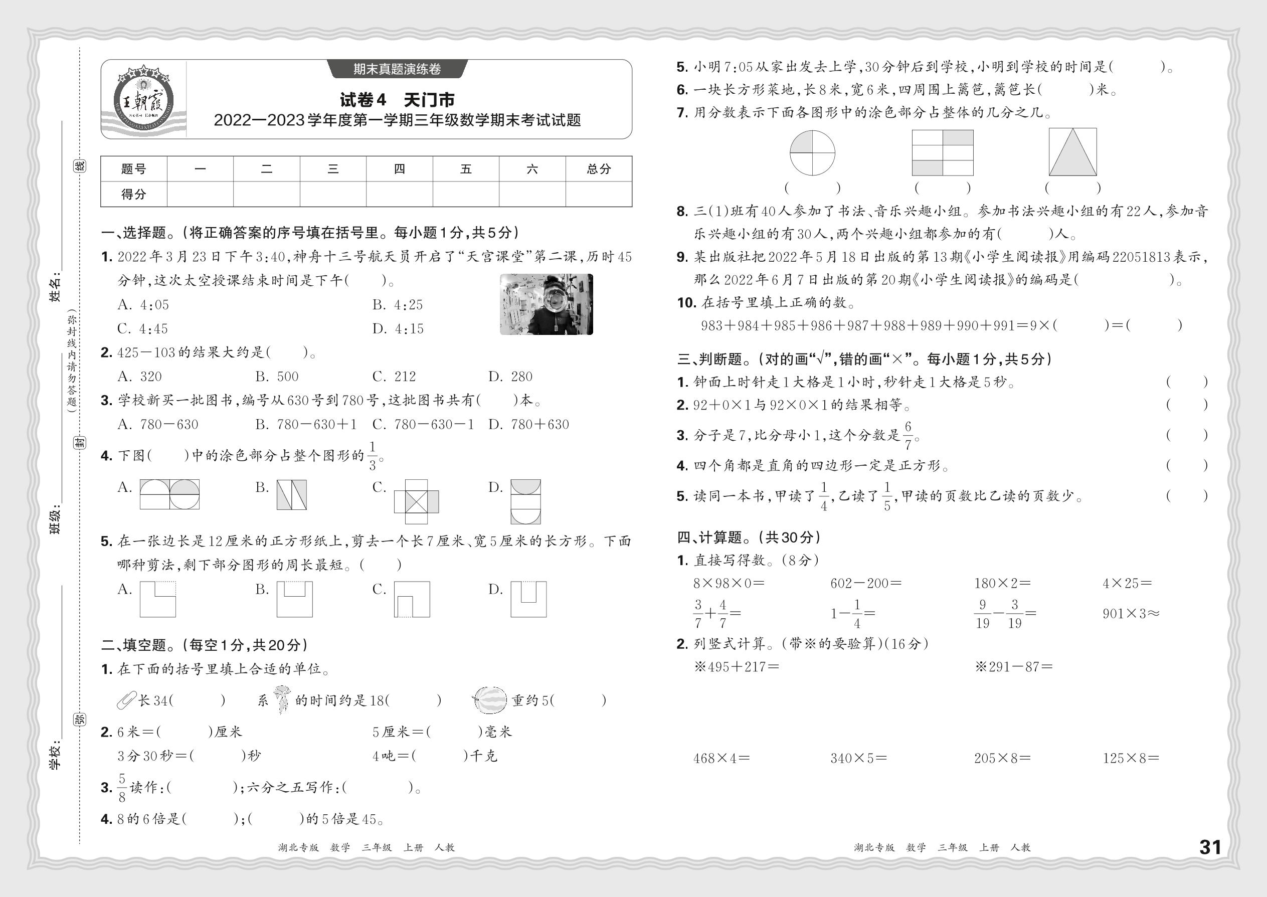 湖北省天门市2022—2023学年度第一学期三年级数学期末考试试题(人教版)【4】