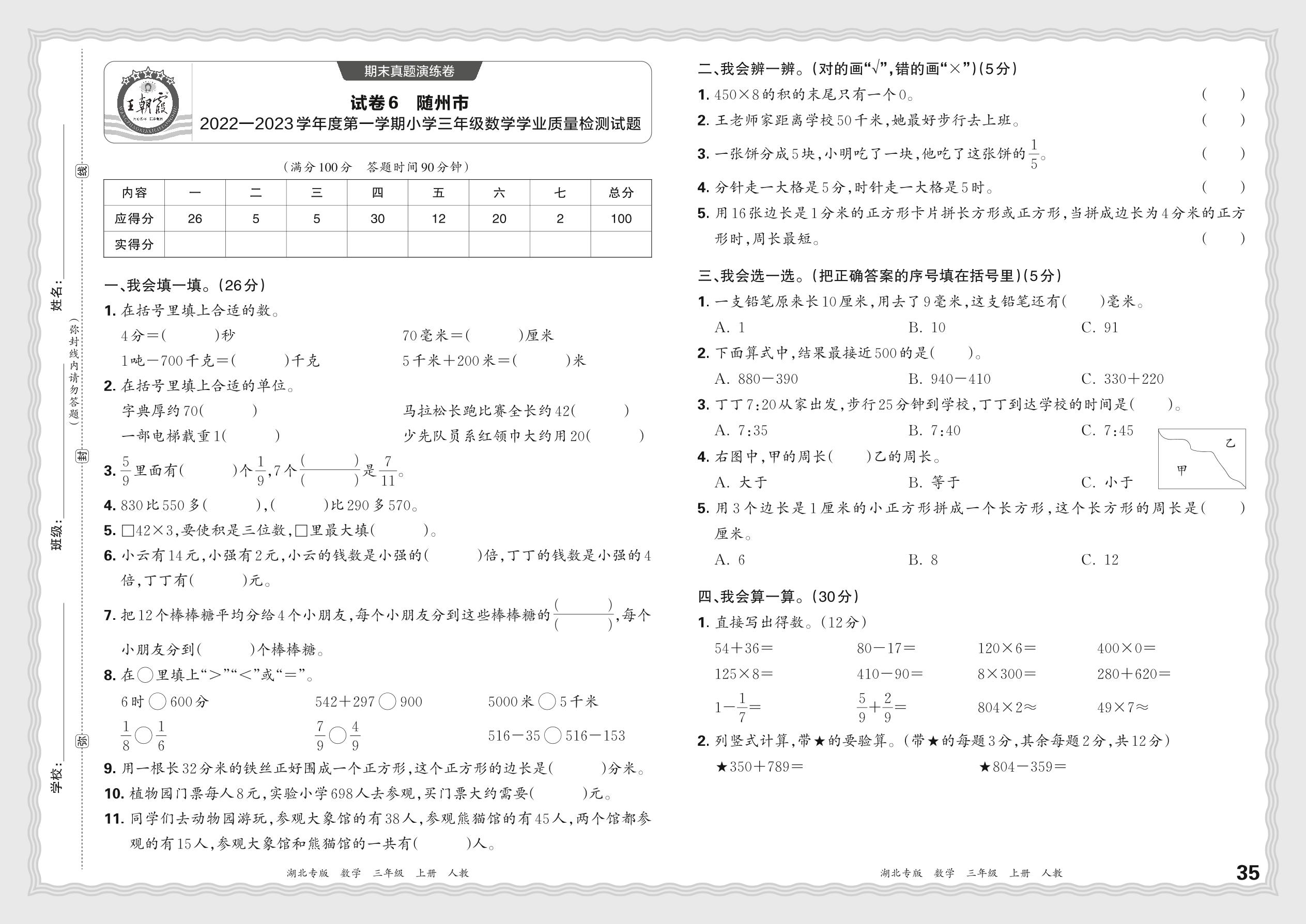 湖北省随州市2022—2023学年度第一学期小学三年级数学学业质量检测试题(人教版)【6】