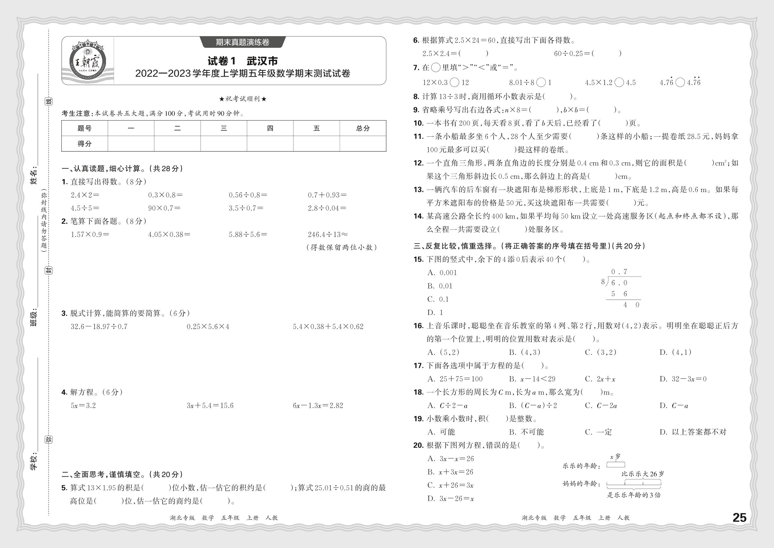 湖北省武汉市2022—2023学年度上学期五年级数学期末测试试卷(人教版)【1】