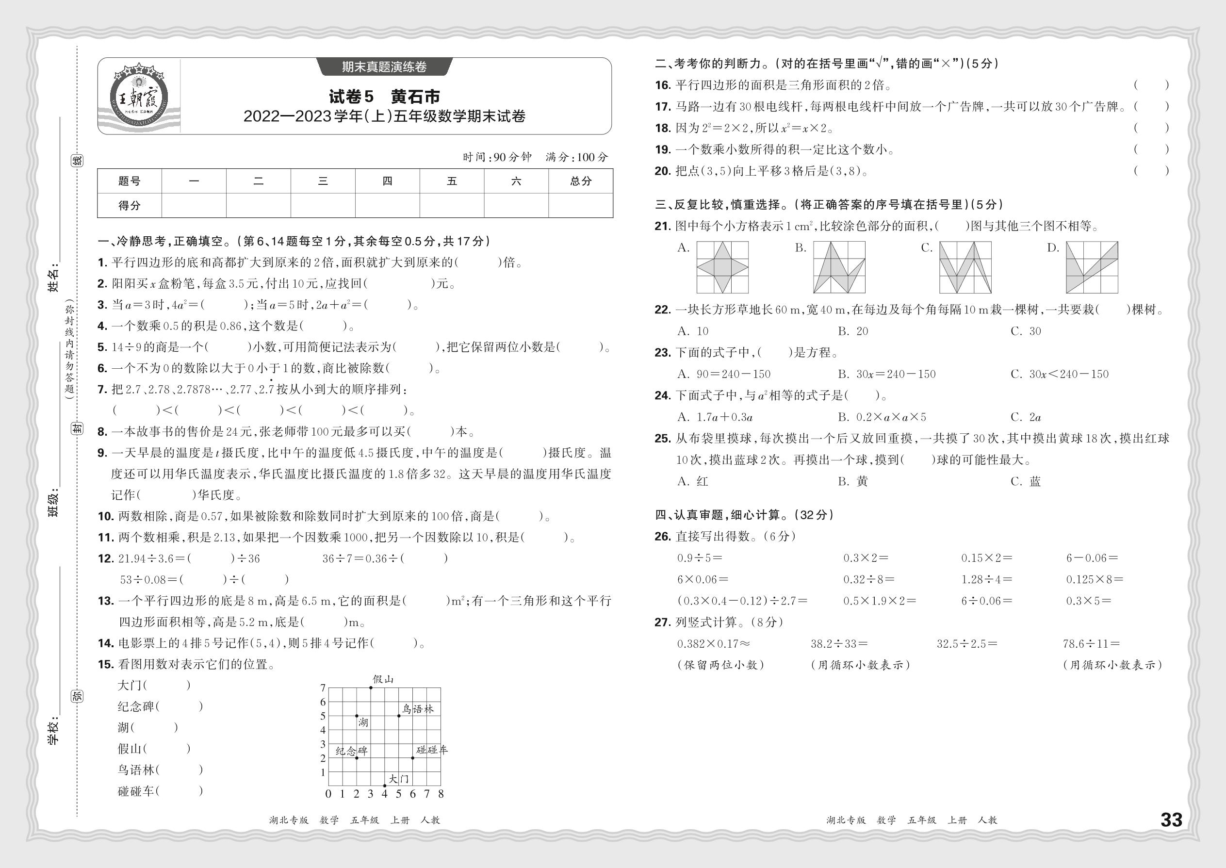 湖北省黄石市2022—2023学年(上)五年级数学期末试卷(人教版)【5】