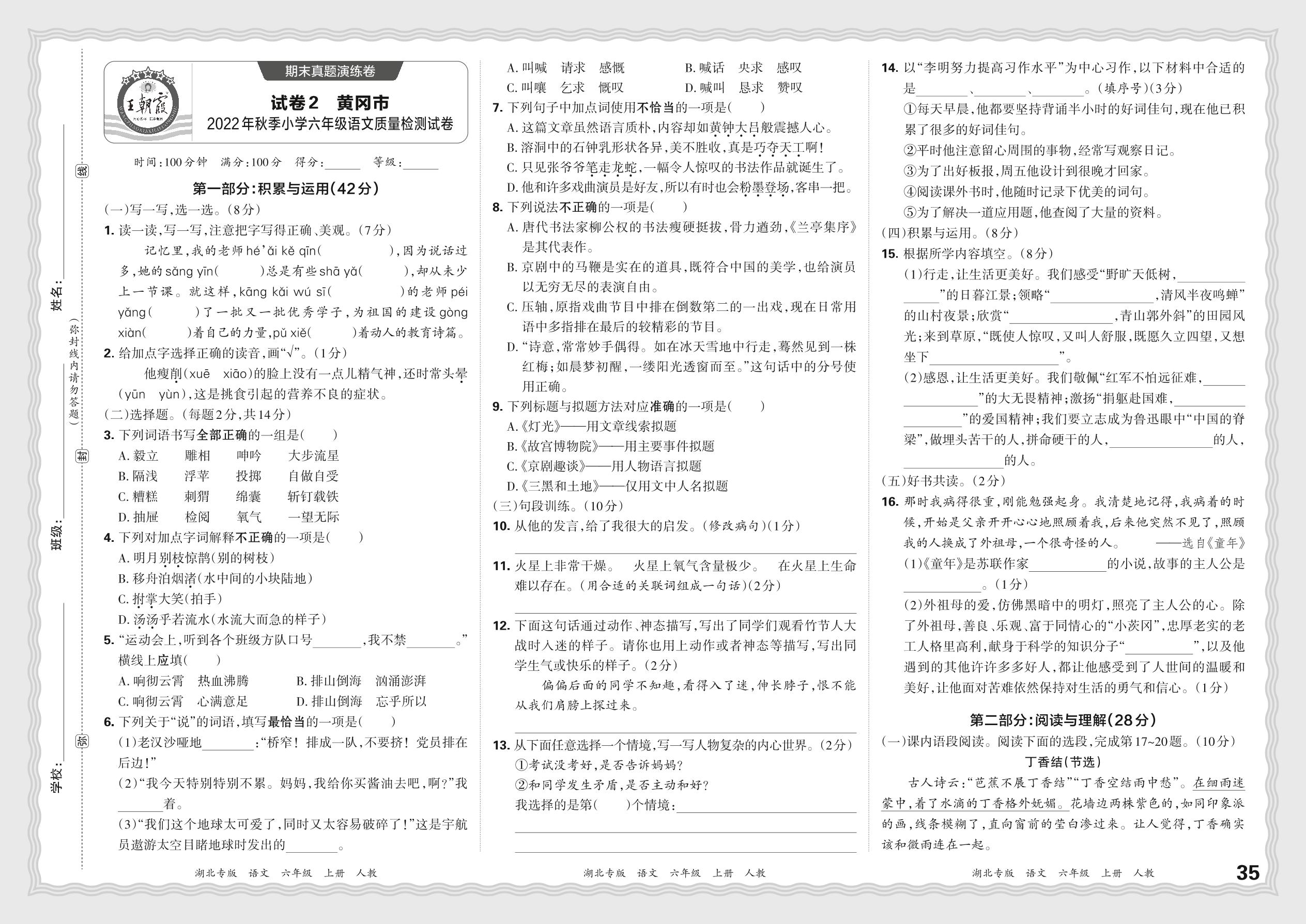 湖北省黄冈市2022年秋季小学六年级语文质量检测试卷(人教版)【2】