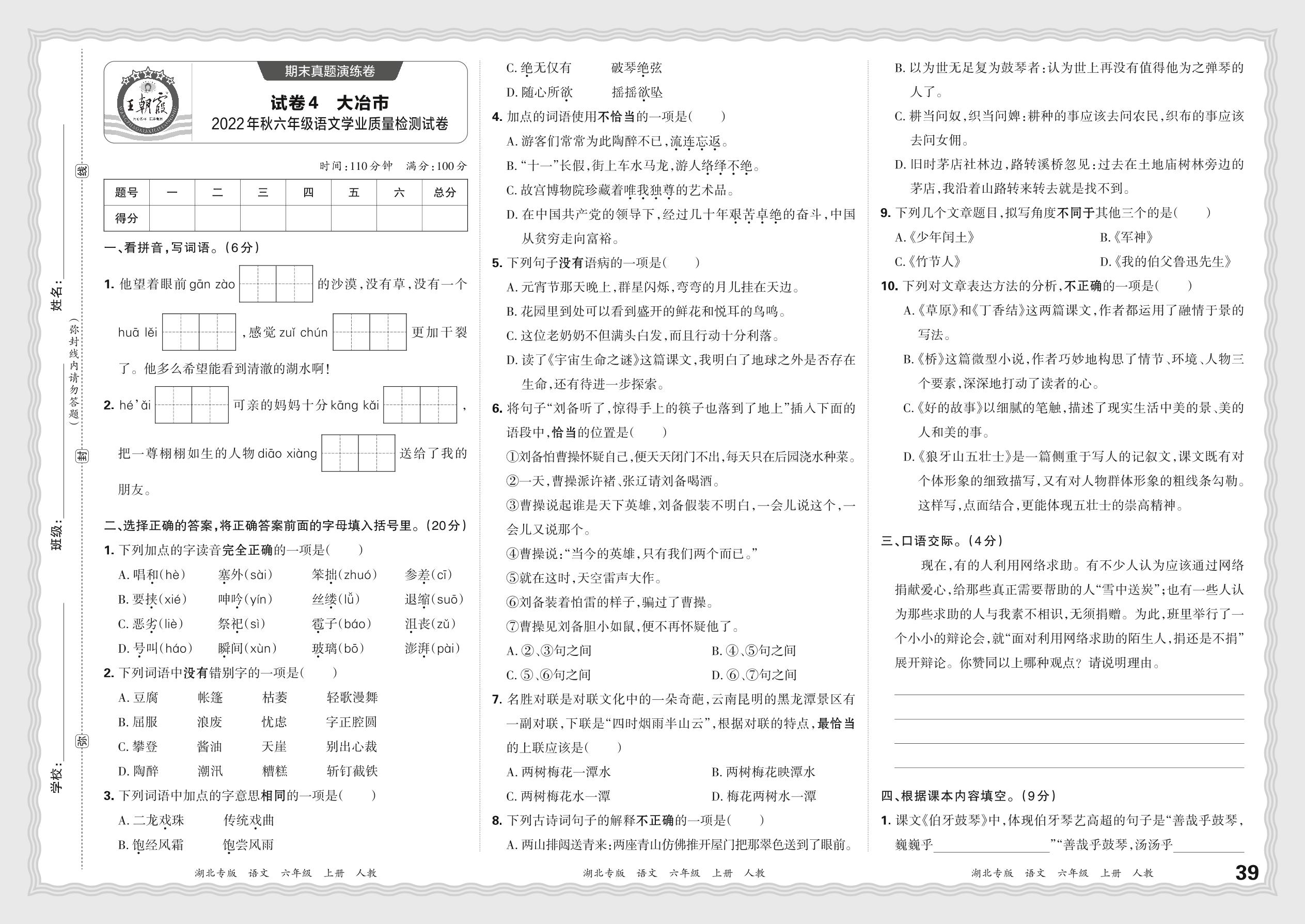 湖北省黄石市大冶市2022年秋六年级语文学业质量检测试卷(人教版)【4】