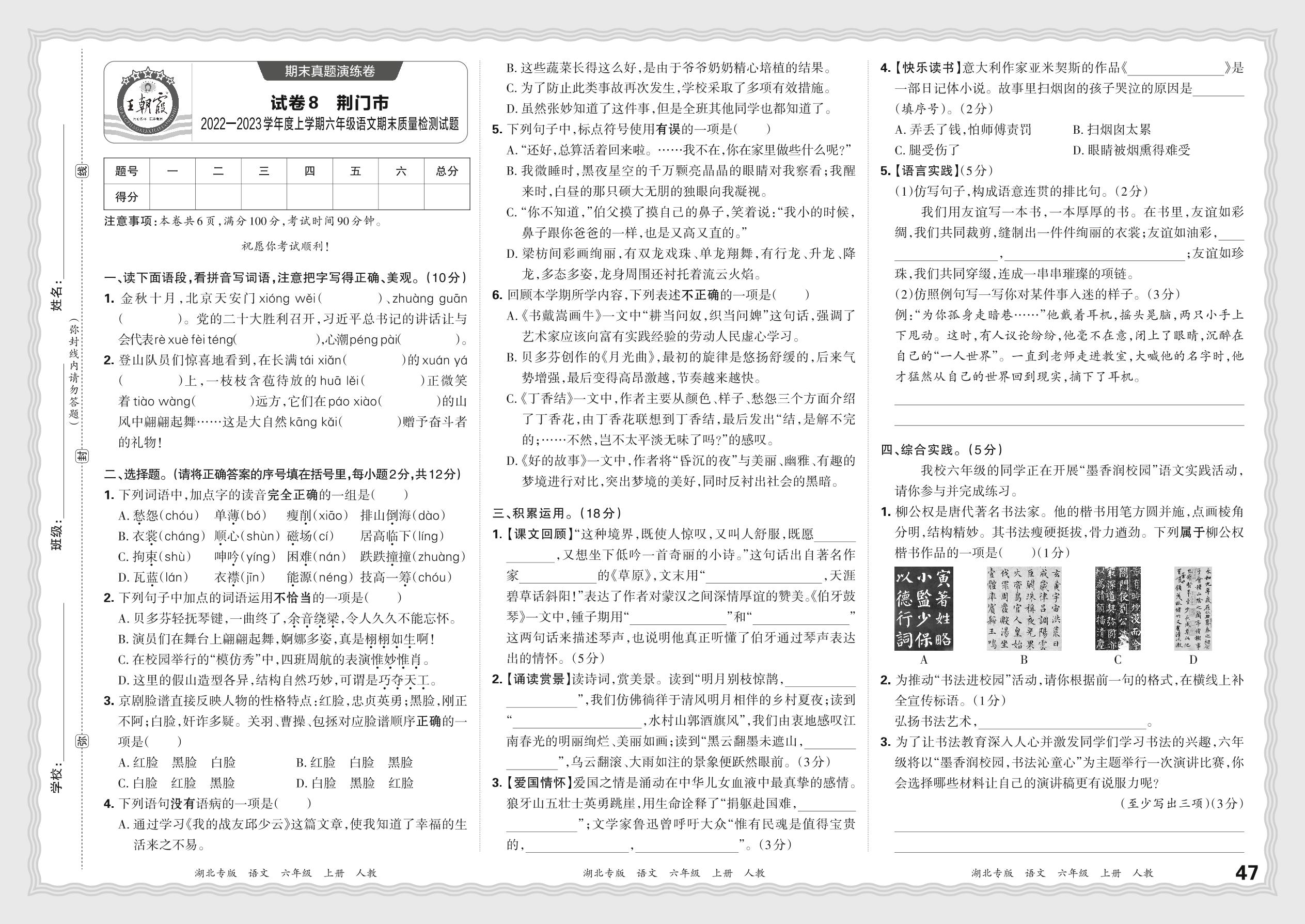 湖北省荆门市2022—2023学年度上学期六年级语文期末质量检测试题(人教版)【8】