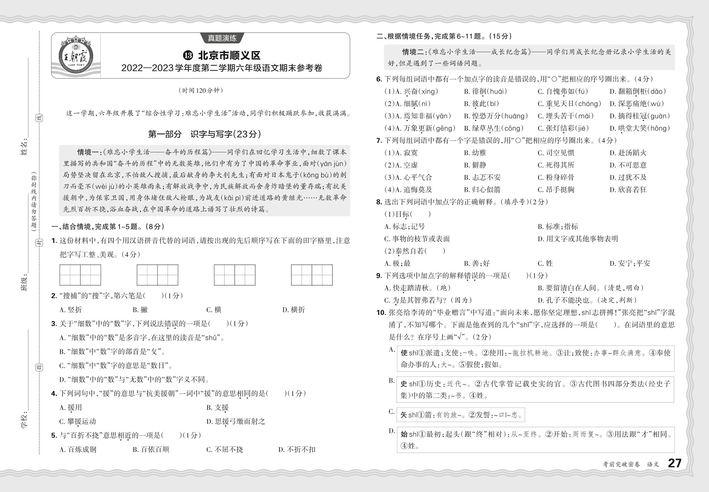 小升初语文·北京市顺义区2022—2023学年度第二学期六年级语文期末参考卷【14】
