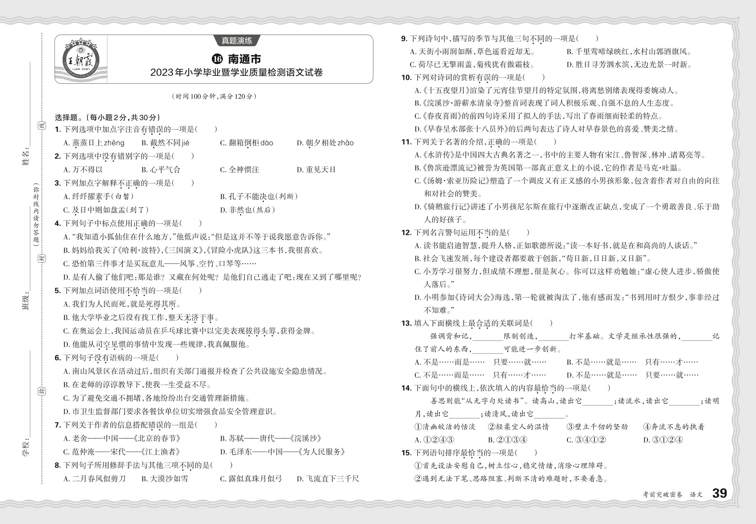 小升初语文·江苏省南通市2023年小学毕业暨学业质量检测语文试卷【17】