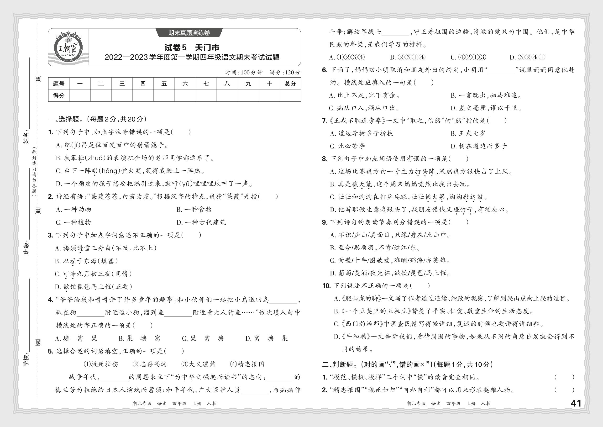湖北省天门市2022—2023学年度第一学期四年级语文期末考试试题(人教版)【5】