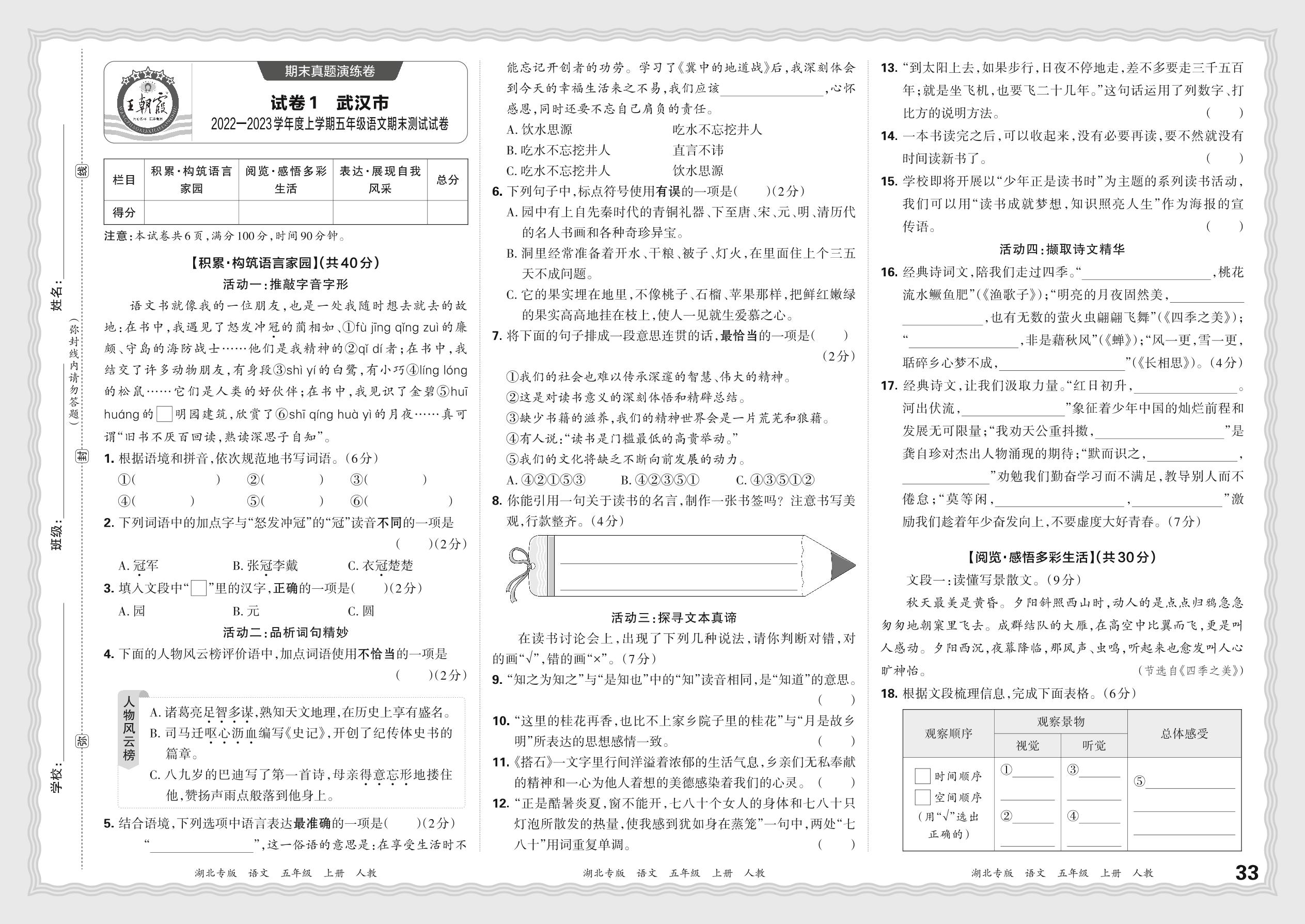 湖北省武汉市2022—2023学年度上学期五年级语文期末测试试卷(人教版)【1】