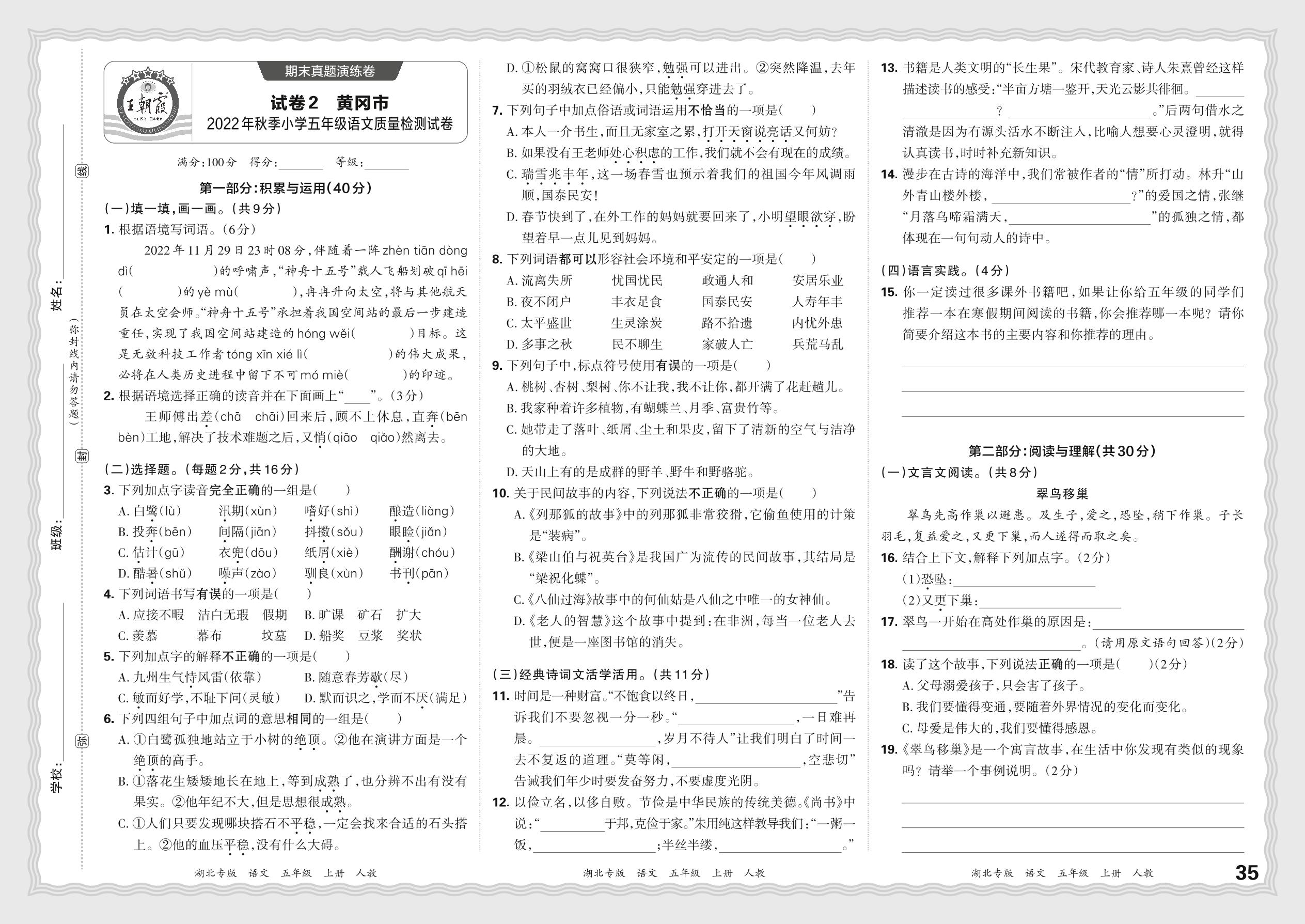 湖北省黄冈市2022年秋季小学五年级语文质量检测试卷(人教版)【2】