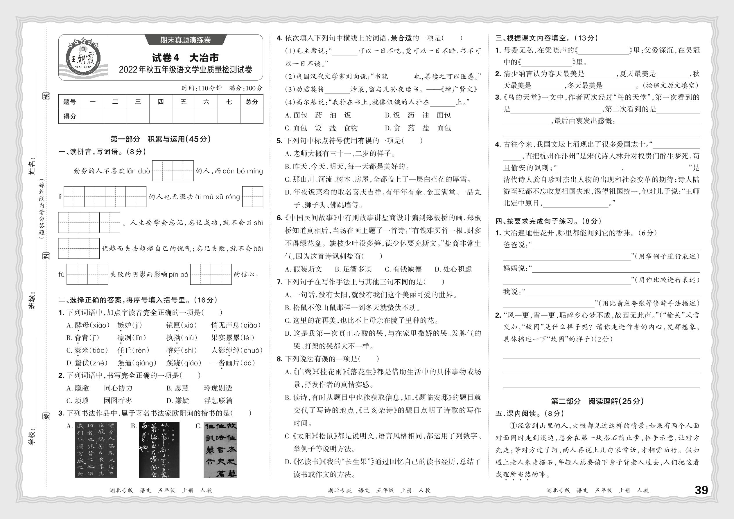 五年级语文人教版上册期末卷