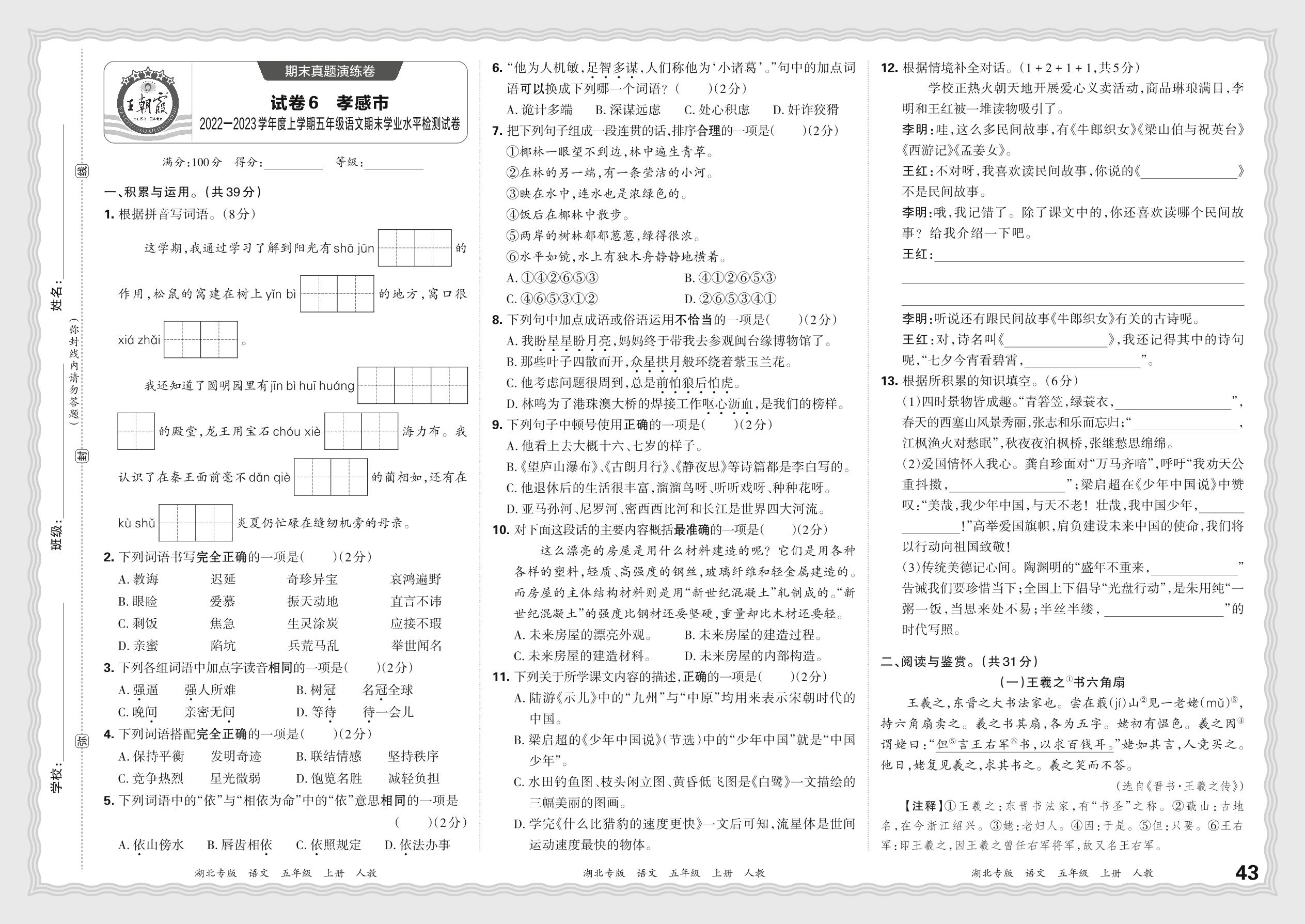 湖北省孝感市2022—2023学年度上学期五年级语文期末学业水平检测试卷(人教版)【6】