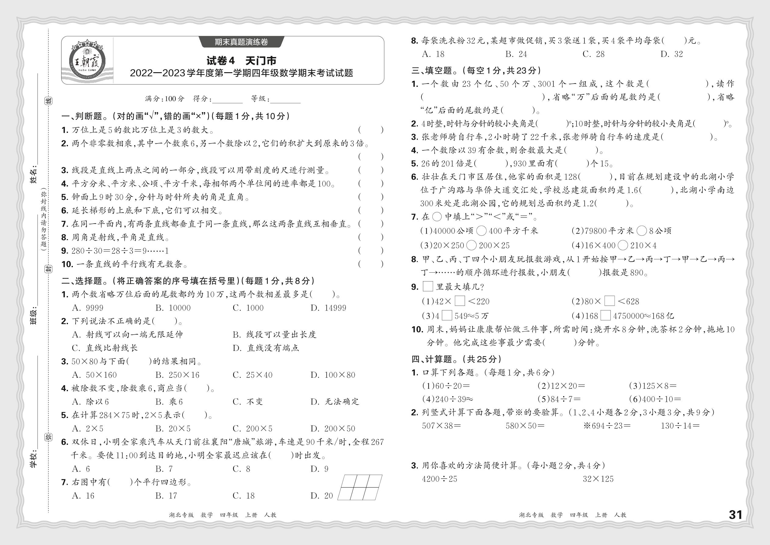 湖北省天门市2022—2023学年度第一学期四年级数学期末考试试题(人教版)【4】