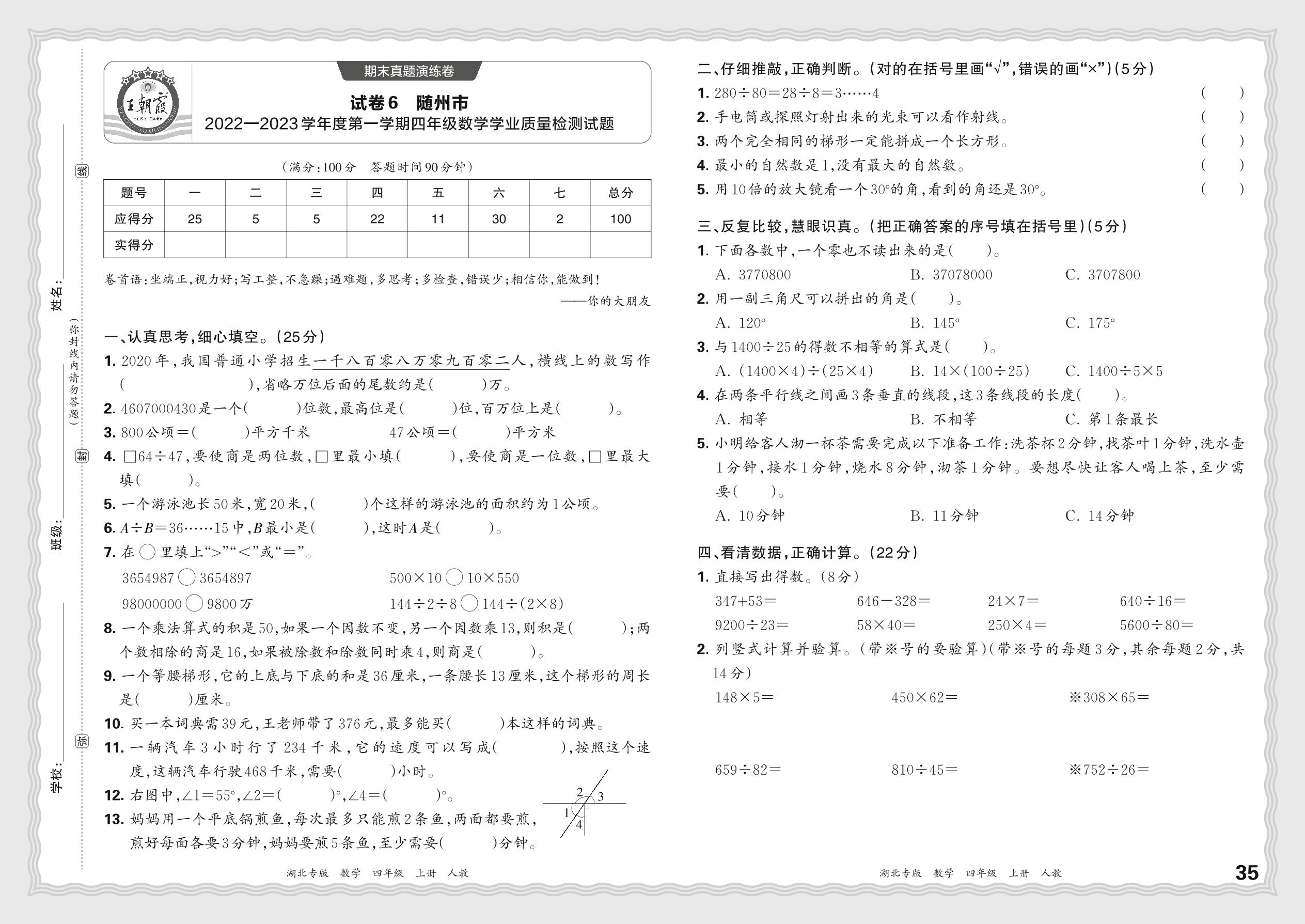 湖北省随州市2022—2023学年度第一学期四年级数学学业质量检测试题(人教版)【6】